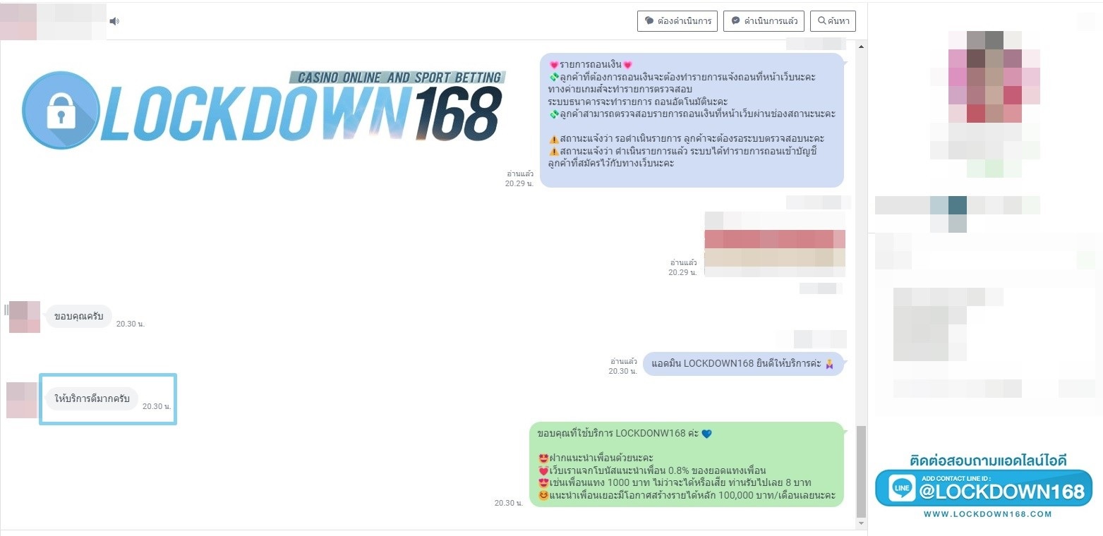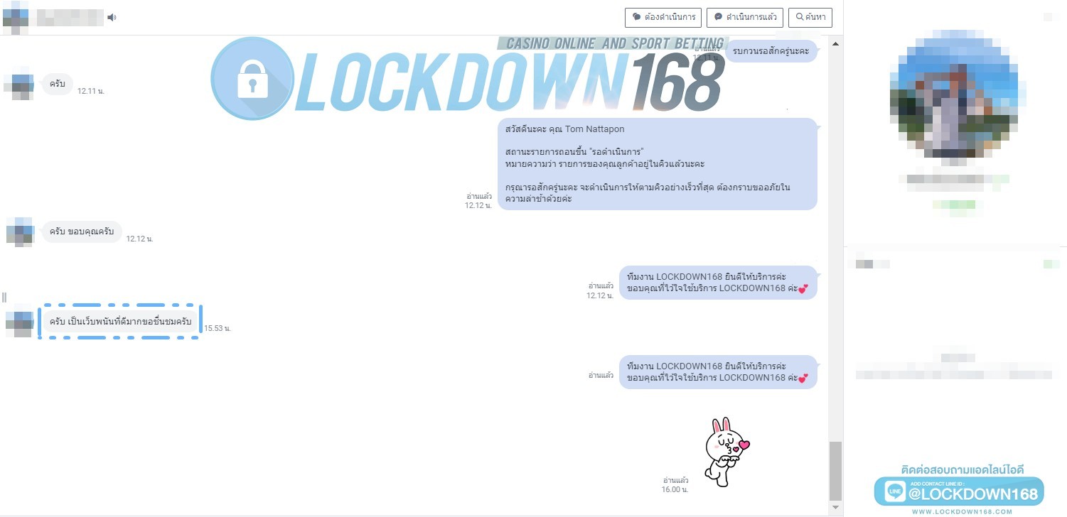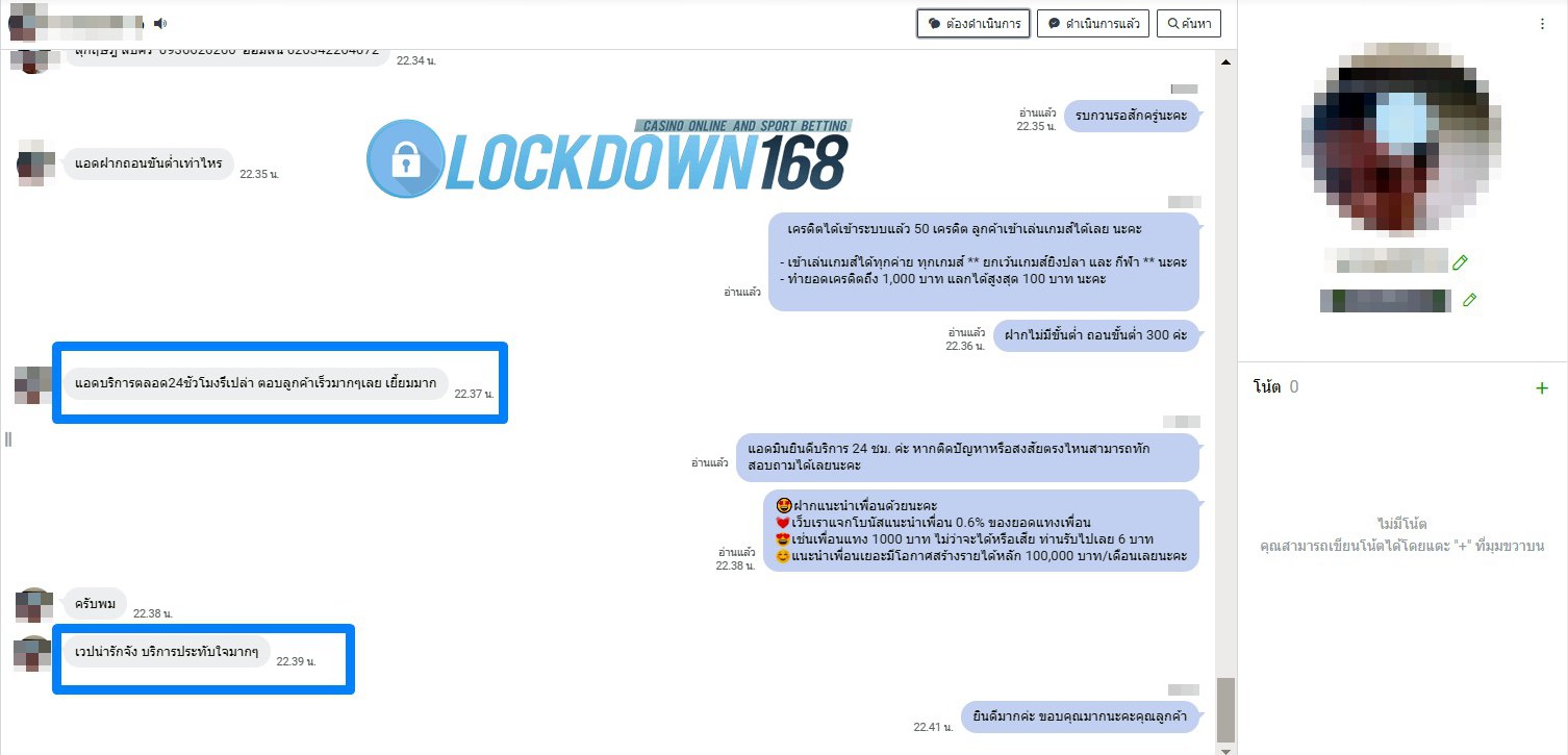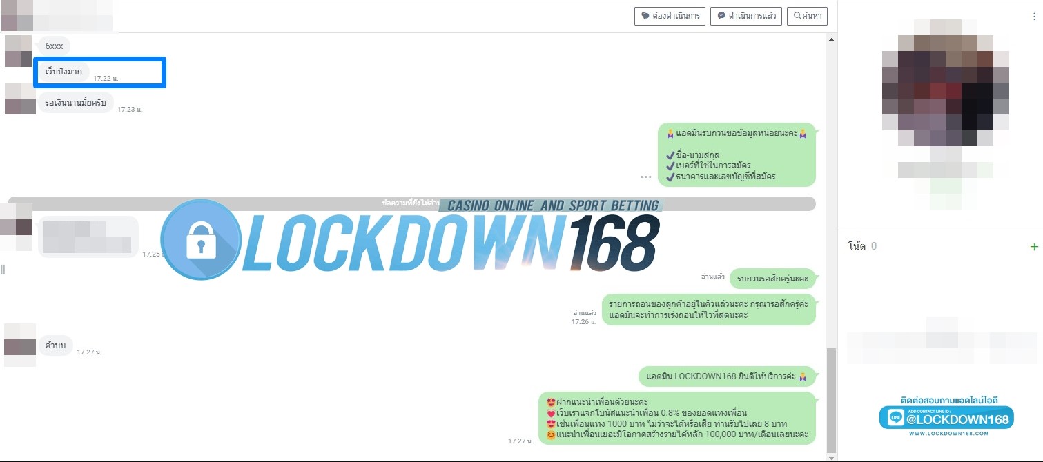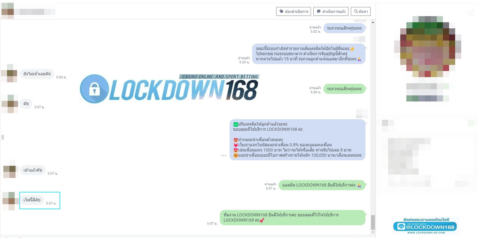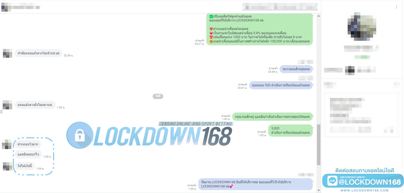 LOCKDOWN168.COM คาสิโนออนไลน์น้องใหม่ที่มาแรงที่สุดในตอนนี้ ด้วยระบบฝาก-ถอนอัตโนมัติ ที่ใช้เทคโนโลยีการจับยอดแบบใหม่ จับยอดฝากได้ภายใน 10 วินาที สามารถเล่นได้ทันทีหลังทำการโอนเงิน และระบบถอนเงินที่สามารถถอนเงินที่หน้าเว็ปได้ด้วยตัวท่านเอง โดยไม่ต้องแจ้งแอดมินและยอดเงินจะเข้าหลังจากทำการถอนภายใน 5 นาที เว็ปของเราคำนึงถึงความสะดวกสบายของลูกค้าเป็นหลัก หากลูกค้าพบปัญหาใดๆก็จะมีเจ้าหน้าที่แอดมินค่อยดูแลอำนวยความสะดวกให้คุณลูกค้าตลอด 24 ชั่วโมง