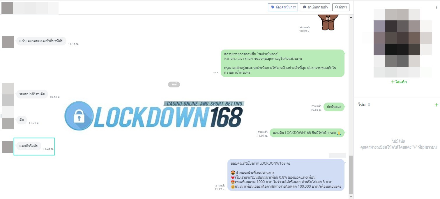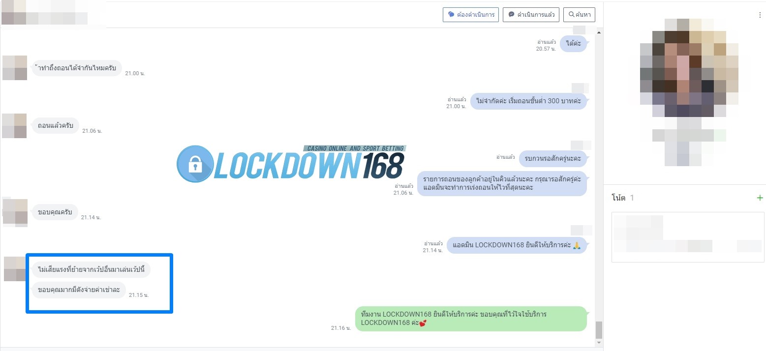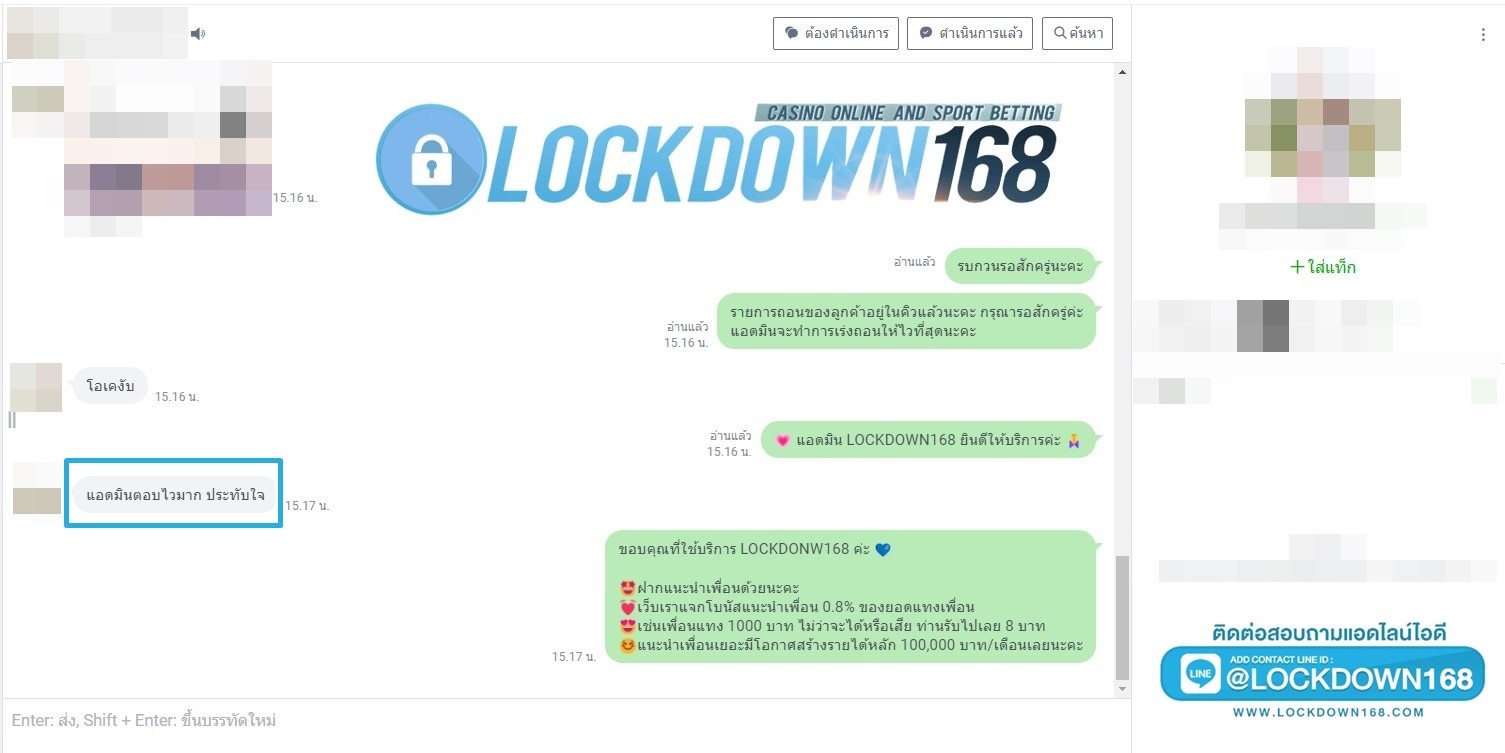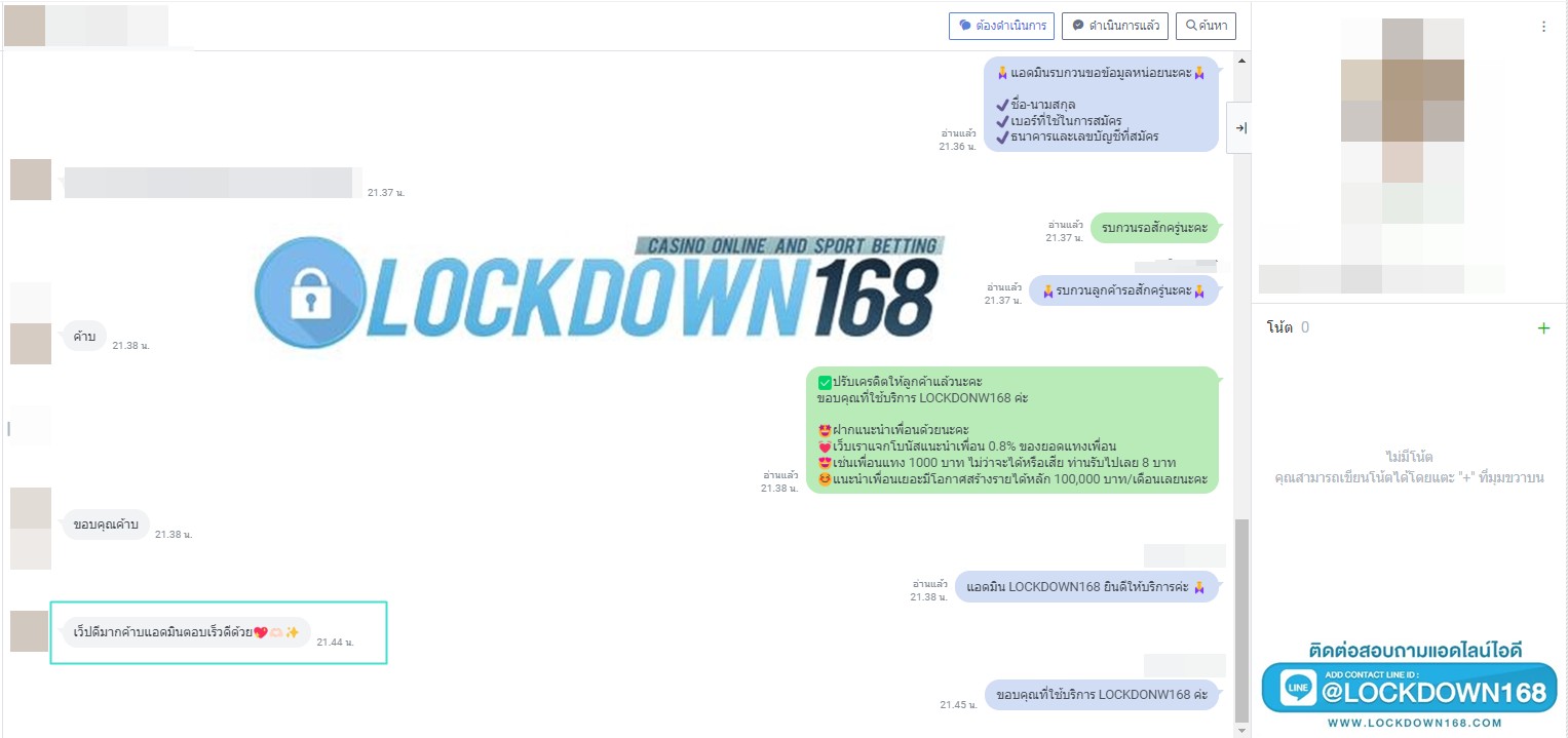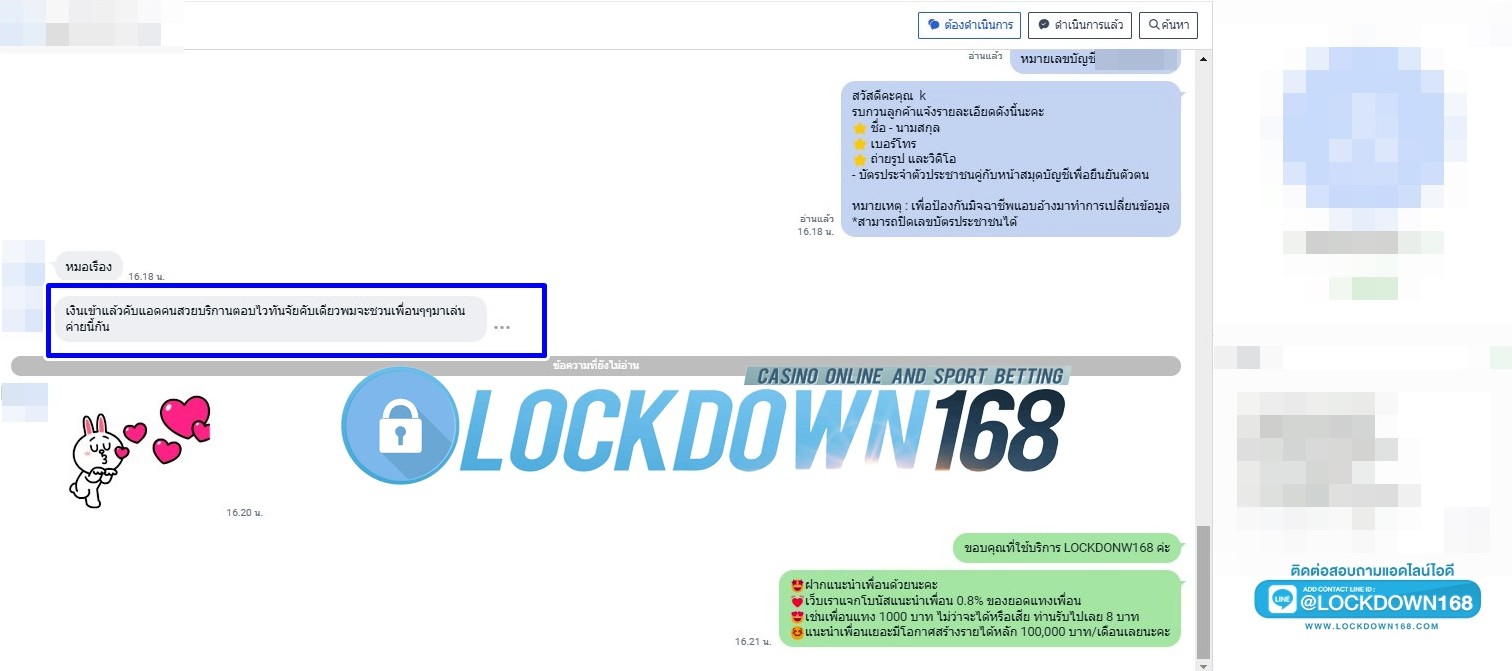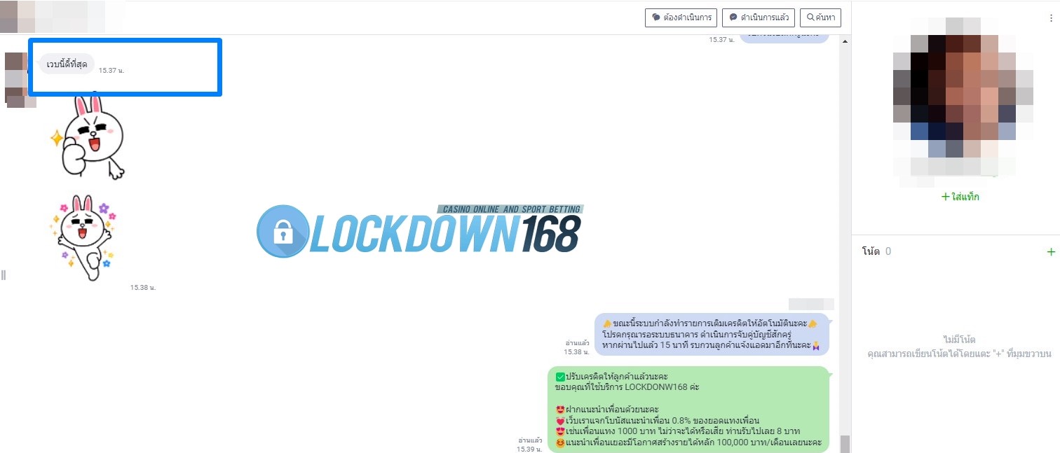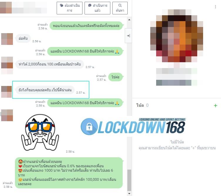LOCKDOWN168.COM คาสิโนออนไลน์น้องใหม่ที่มาแรงที่สุดในตอนนี้ ด้วยระบบฝาก-ถอนอัตโนมัติ ที่ใช้เทคโนโลยีการจับยอดแบบใหม่ จับยอดฝากได้ภายใน 10 วินาที สามารถเล่นได้ทันทีหลังทำการโอนเงิน และระบบถอนเงินที่สามารถถอนเงินที่หน้าเว็ปได้ด้วยตัวท่านเอง โดยไม่ต้องแจ้งแอดมินและยอดเงินจะเข้าหลังจากทำการถอนภายใน 5 นาที เว็ปของเราคำนึงถึงความสะดวกสบายของลูกค้าเป็นหลัก หากลูกค้าพบปัญหาใดๆก็จะมีเจ้าหน้าที่แอดมินค่อยดูแลอำนวยความสะดวกให้คุณลูกค้าตลอด 24 ชั่วโมง