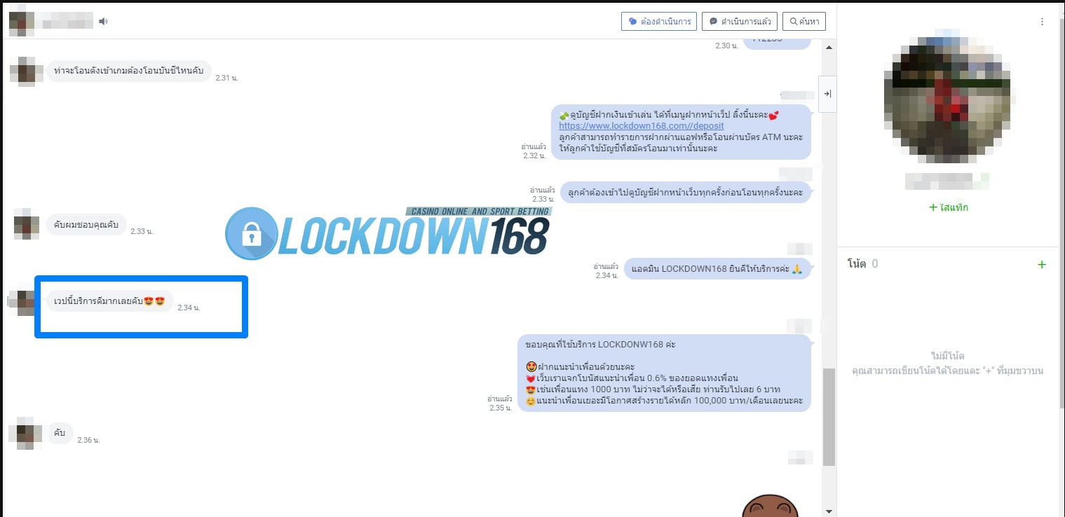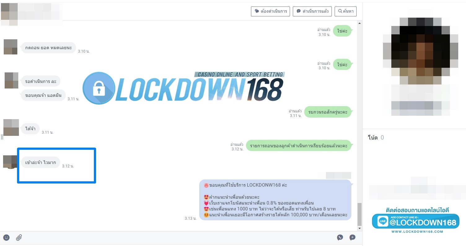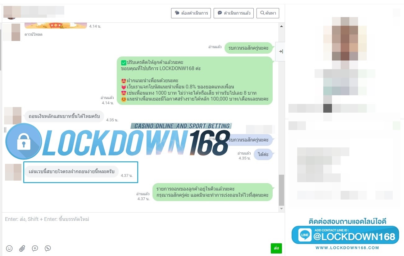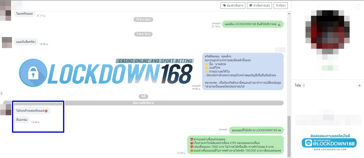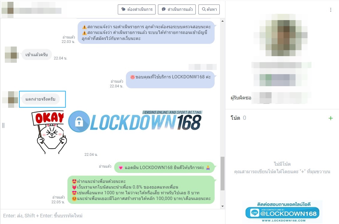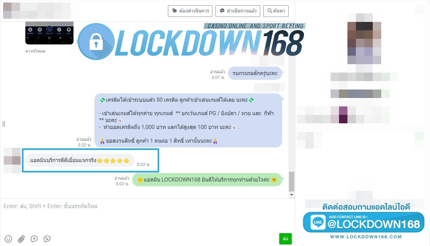 LOCKDOWN168.COM คาสิโนออนไลน์น้องใหม่ที่มาแรงที่สุดในตอนนี้ ด้วยระบบฝาก-ถอนอัตโนมัติ ที่ใช้เทคโนโลยีการจับยอดแบบใหม่ จับยอดฝากได้ภายใน 10 วินาที สามารถเล่นได้ทันทีหลังทำการโอนเงิน และระบบถอนเงินที่สามารถถอนเงินที่หน้าเว็ปได้ด้วยตัวท่านเอง โดยไม่ต้องแจ้งแอดมินและยอดเงินจะเข้าหลังจากทำการถอนภายใน 5 นาที เว็ปของเราคำนึงถึงความสะดวกสบายของลูกค้าเป็นหลัก หากลูกค้าพบปัญหาใดๆก็จะมีเจ้าหน้าที่แอดมินค่อยดูแลอำนวยความสะดวกให้คุณลูกค้าตลอด 24 ชั่วโมง