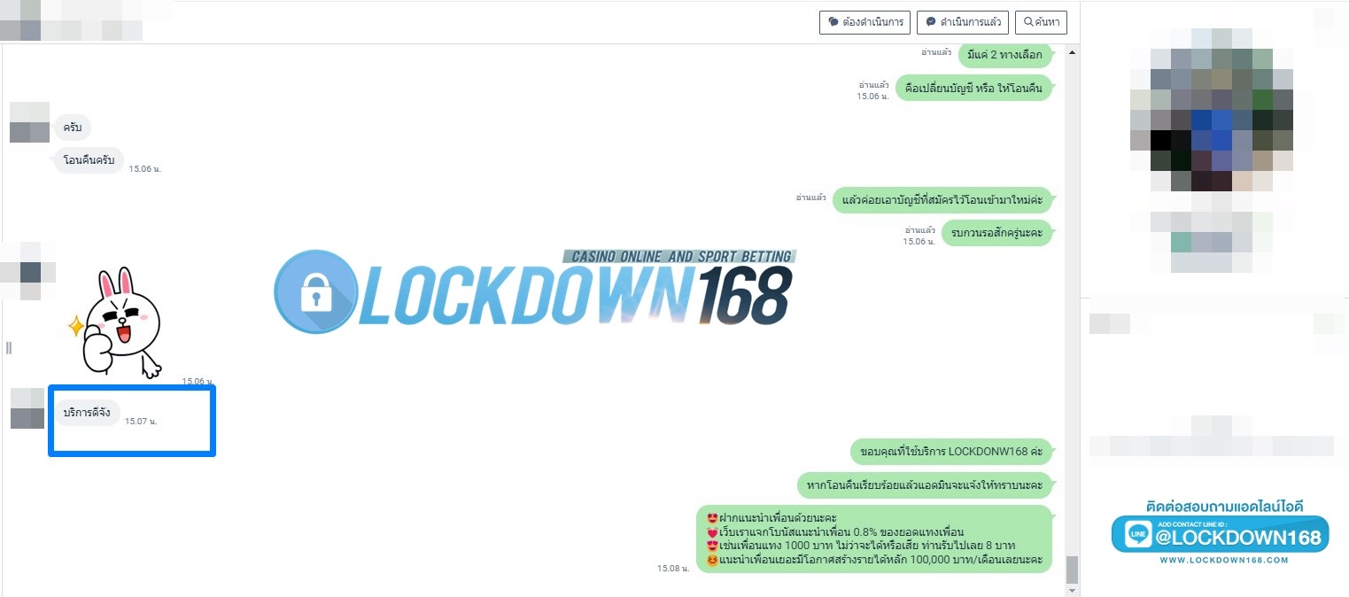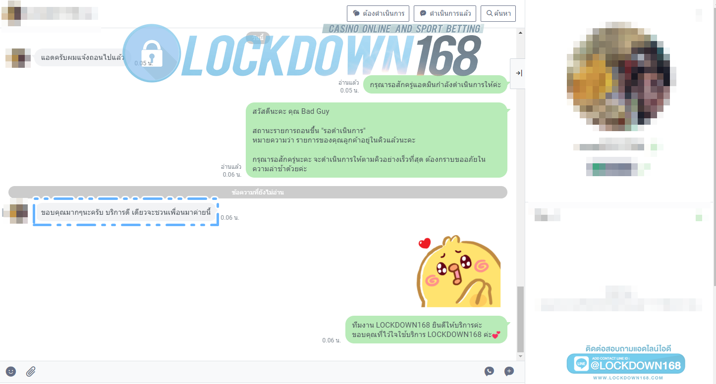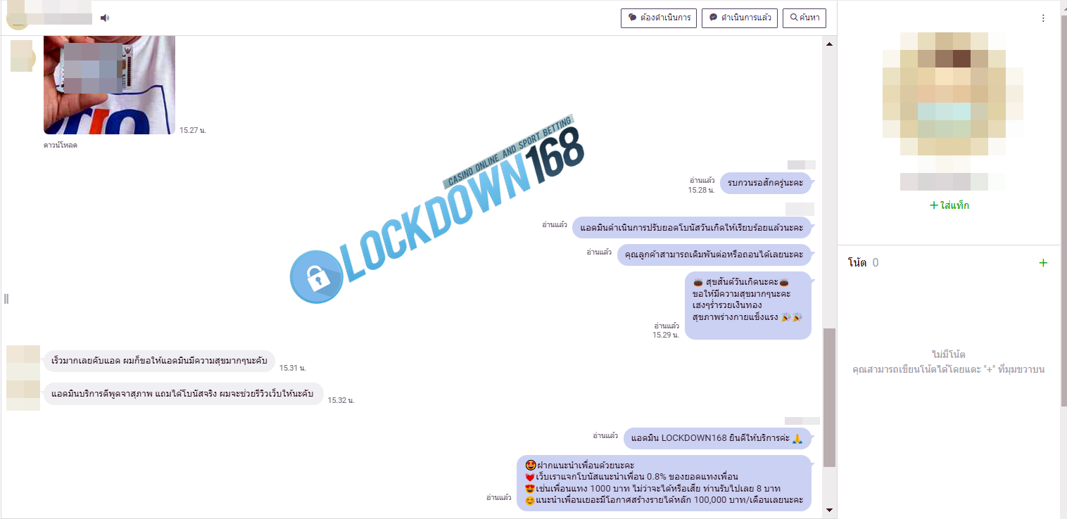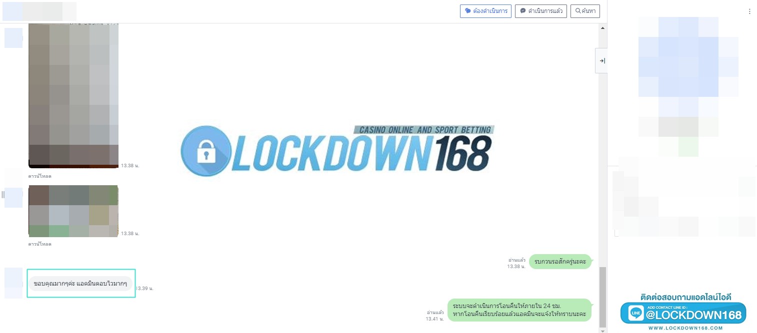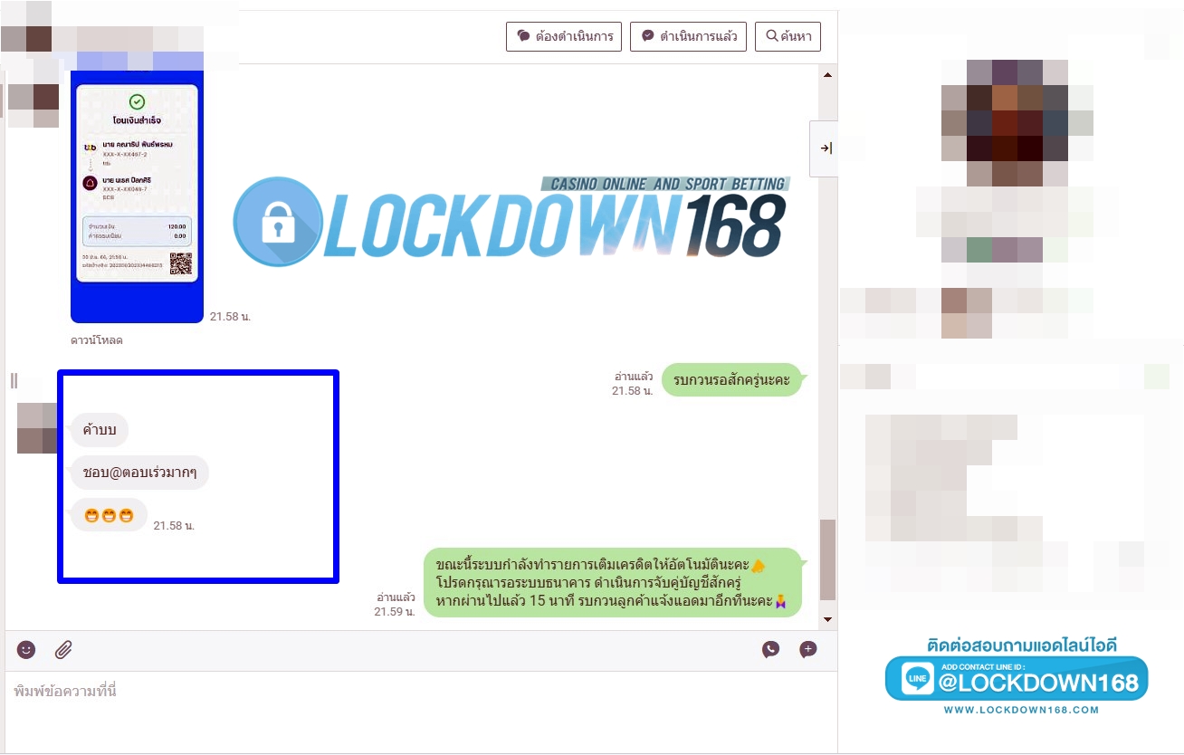 LOCKDOWN168.COM คาสิโนออนไลน์น้องใหม่ที่มาแรงที่สุดในตอนนี้ ด้วยระบบฝาก-ถอนอัตโนมัติ ที่ใช้เทคโนโลยีการจับยอดแบบใหม่ จับยอดฝากได้ภายใน 10 วินาที สามารถเล่นได้ทันทีหลังทำการโอนเงิน และระบบถอนเงินที่สามารถถอนเงินที่หน้าเว็ปได้ด้วยตัวท่านเอง โดยไม่ต้องแจ้งแอดมินและยอดเงินจะเข้าหลังจากทำการถอนภายใน 5 นาที เว็ปของเราคำนึงถึงความสะดวกสบายของลูกค้าเป็นหลัก หากลูกค้าพบปัญหาใดๆก็จะมีเจ้าหน้าที่แอดมินค่อยดูแลอำนวยความสะดวกให้คุณลูกค้าตลอด 24 ชั่วโมง