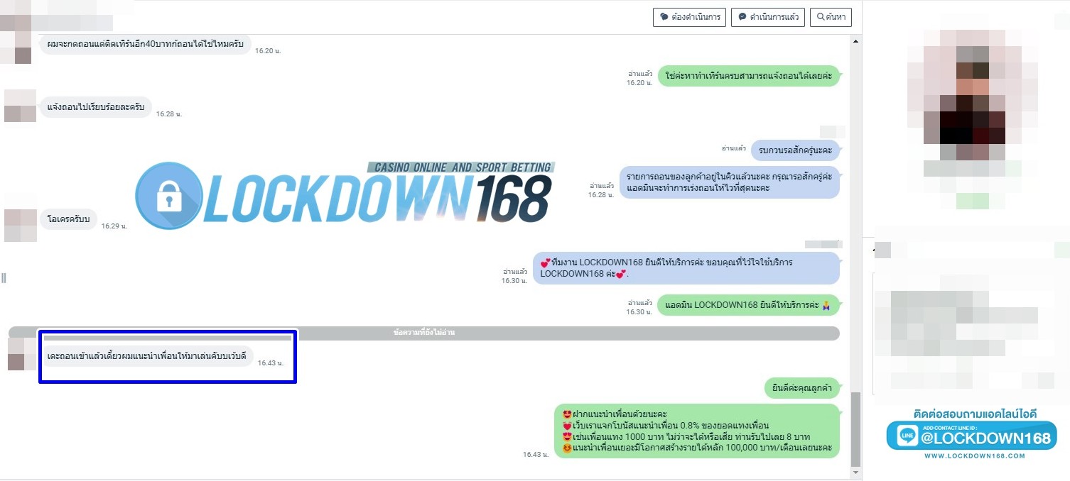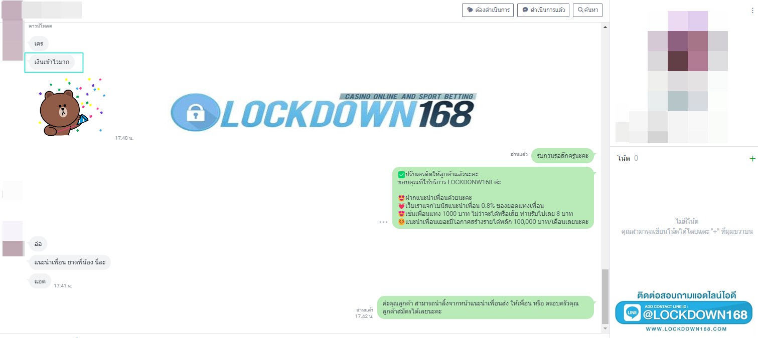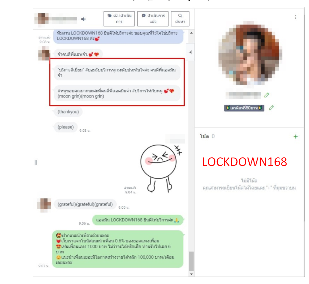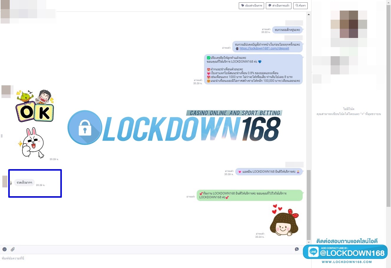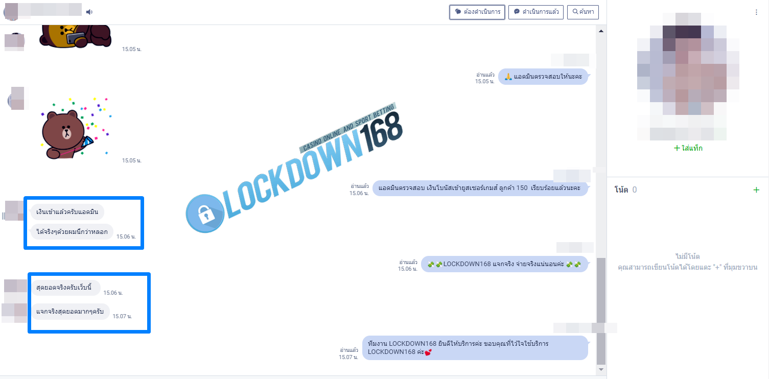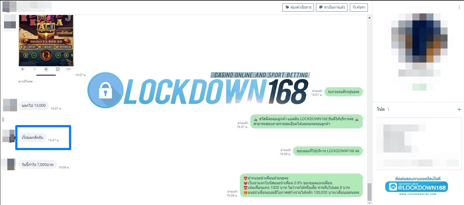 LOCKDOWN168.COM คาสิโนออนไลน์น้องใหม่ที่มาแรงที่สุดในตอนนี้ ด้วยระบบฝาก-ถอนอัตโนมัติ ที่ใช้เทคโนโลยีการจับยอดแบบใหม่ จับยอดฝากได้ภายใน 10 วินาที สามารถเล่นได้ทันทีหลังทำการโอนเงิน และระบบถอนเงินที่สามารถถอนเงินที่หน้าเว็ปได้ด้วยตัวท่านเอง โดยไม่ต้องแจ้งแอดมินและยอดเงินจะเข้าหลังจากทำการถอนภายใน 5 นาที เว็ปของเราคำนึงถึงความสะดวกสบายของลูกค้าเป็นหลัก หากลูกค้าพบปัญหาใดๆก็จะมีเจ้าหน้าที่แอดมินค่อยดูแลอำนวยความสะดวกให้คุณลูกค้าตลอด 24 ชั่วโมง