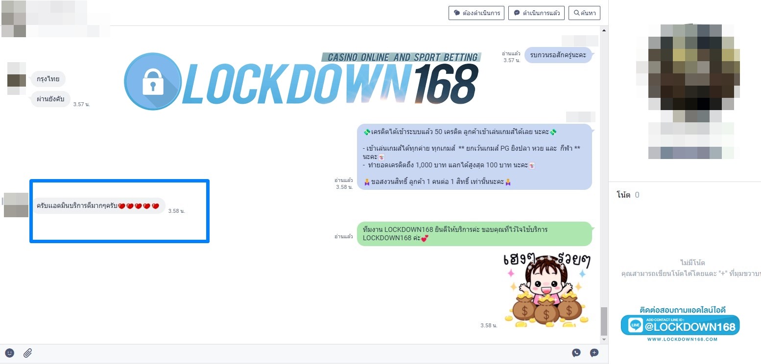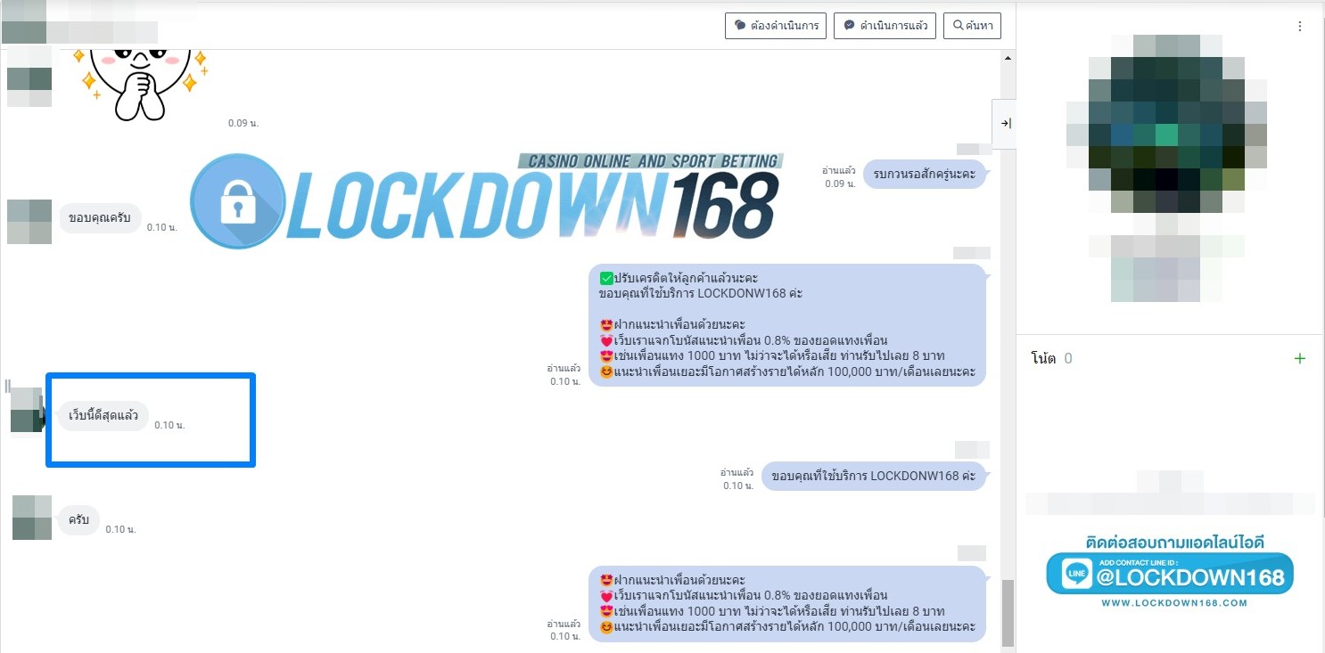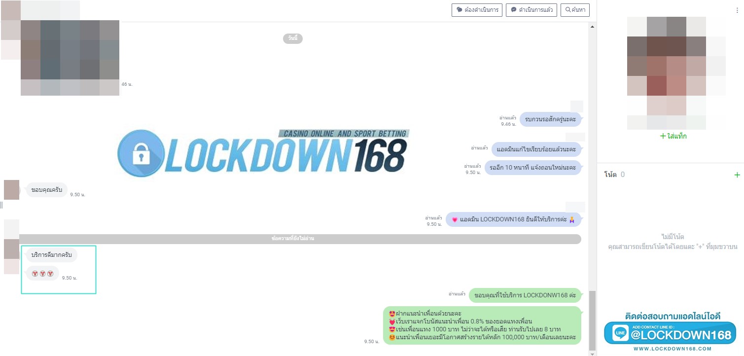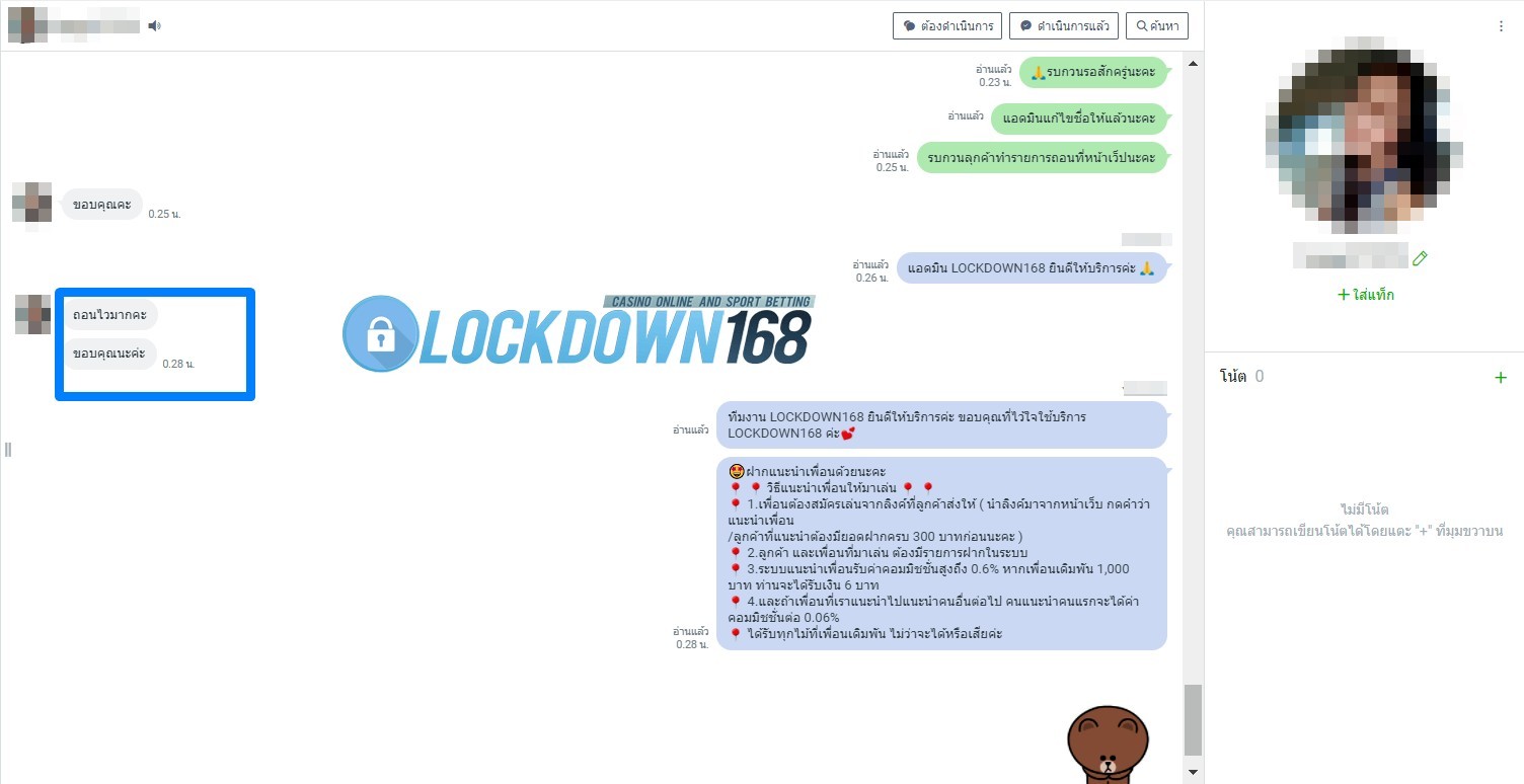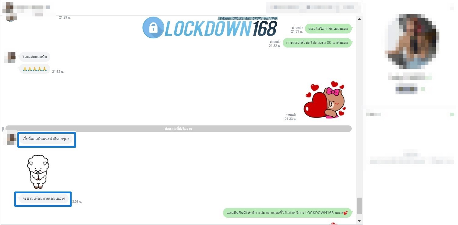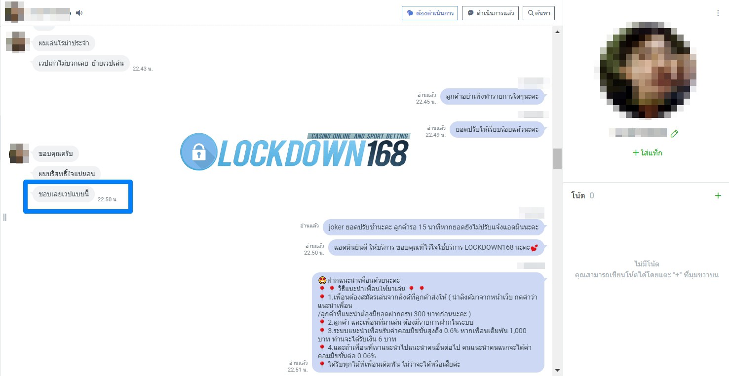 LOCKDOWN168.COM คาสิโนออนไลน์น้องใหม่ที่มาแรงที่สุดในตอนนี้ ด้วยระบบฝาก-ถอนอัตโนมัติ ที่ใช้เทคโนโลยีการจับยอดแบบใหม่ จับยอดฝากได้ภายใน 10 วินาที สามารถเล่นได้ทันทีหลังทำการโอนเงิน และระบบถอนเงินที่สามารถถอนเงินที่หน้าเว็ปได้ด้วยตัวท่านเอง โดยไม่ต้องแจ้งแอดมินและยอดเงินจะเข้าหลังจากทำการถอนภายใน 5 นาที เว็ปของเราคำนึงถึงความสะดวกสบายของลูกค้าเป็นหลัก หากลูกค้าพบปัญหาใดๆก็จะมีเจ้าหน้าที่แอดมินค่อยดูแลอำนวยความสะดวกให้คุณลูกค้าตลอด 24 ชั่วโมง