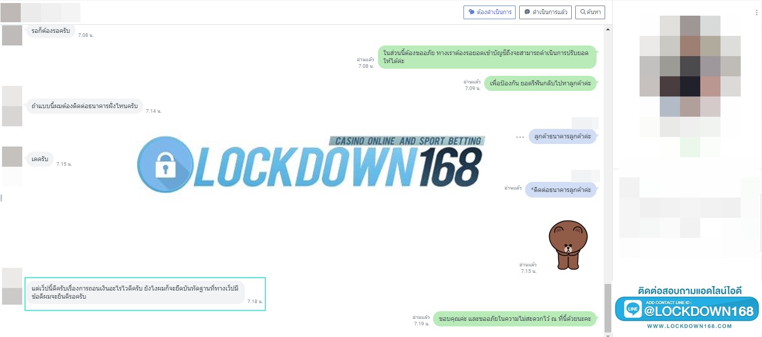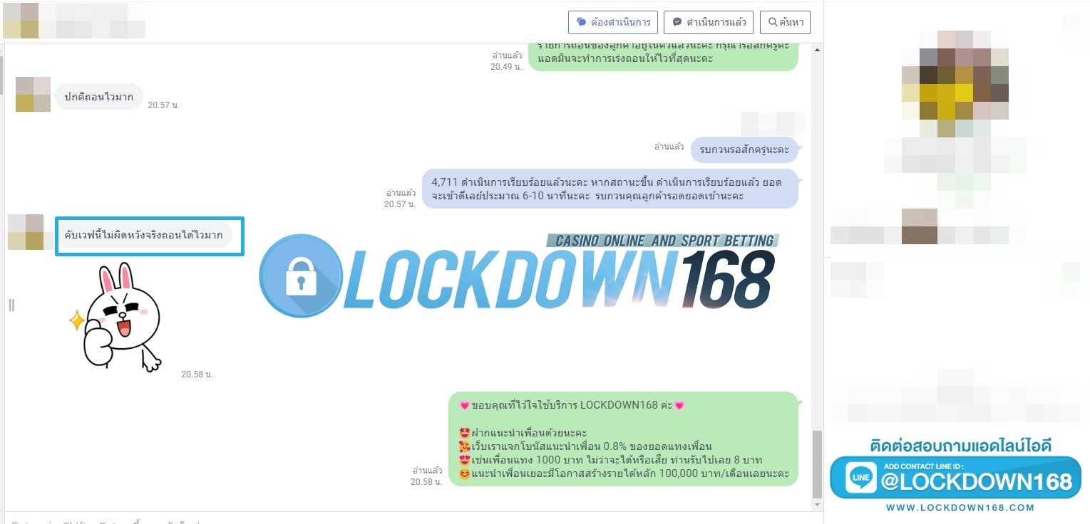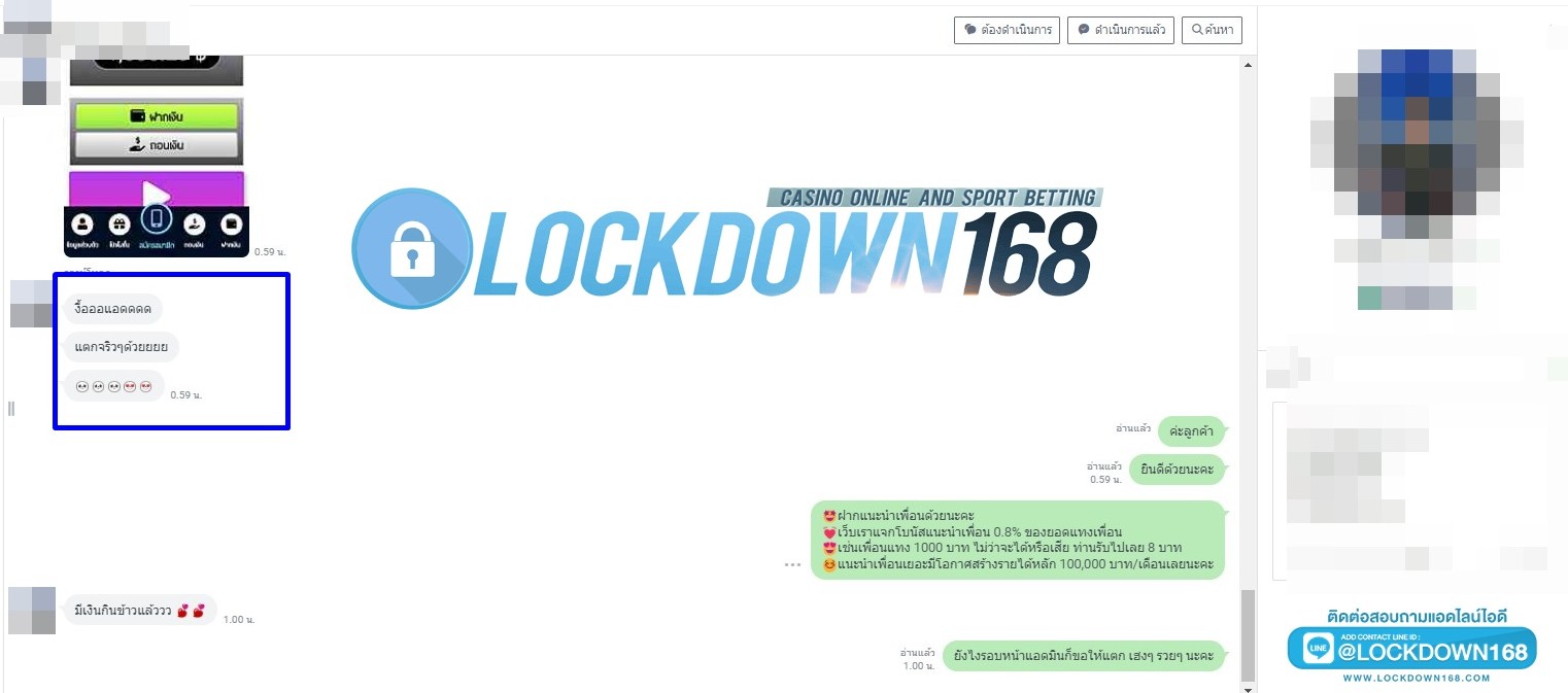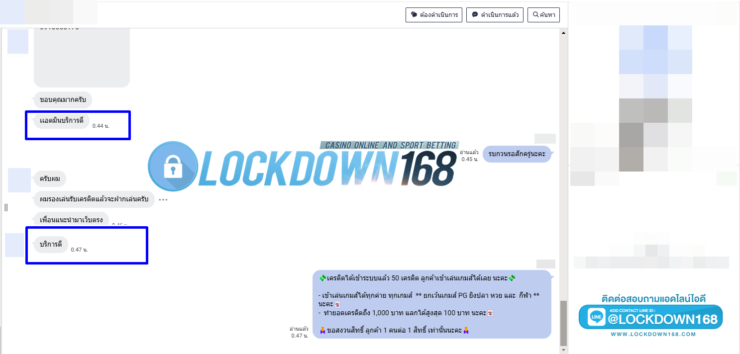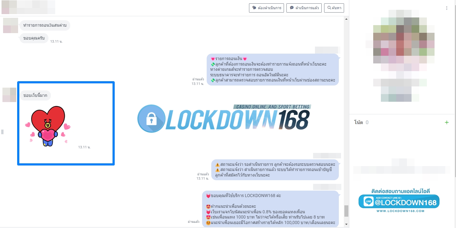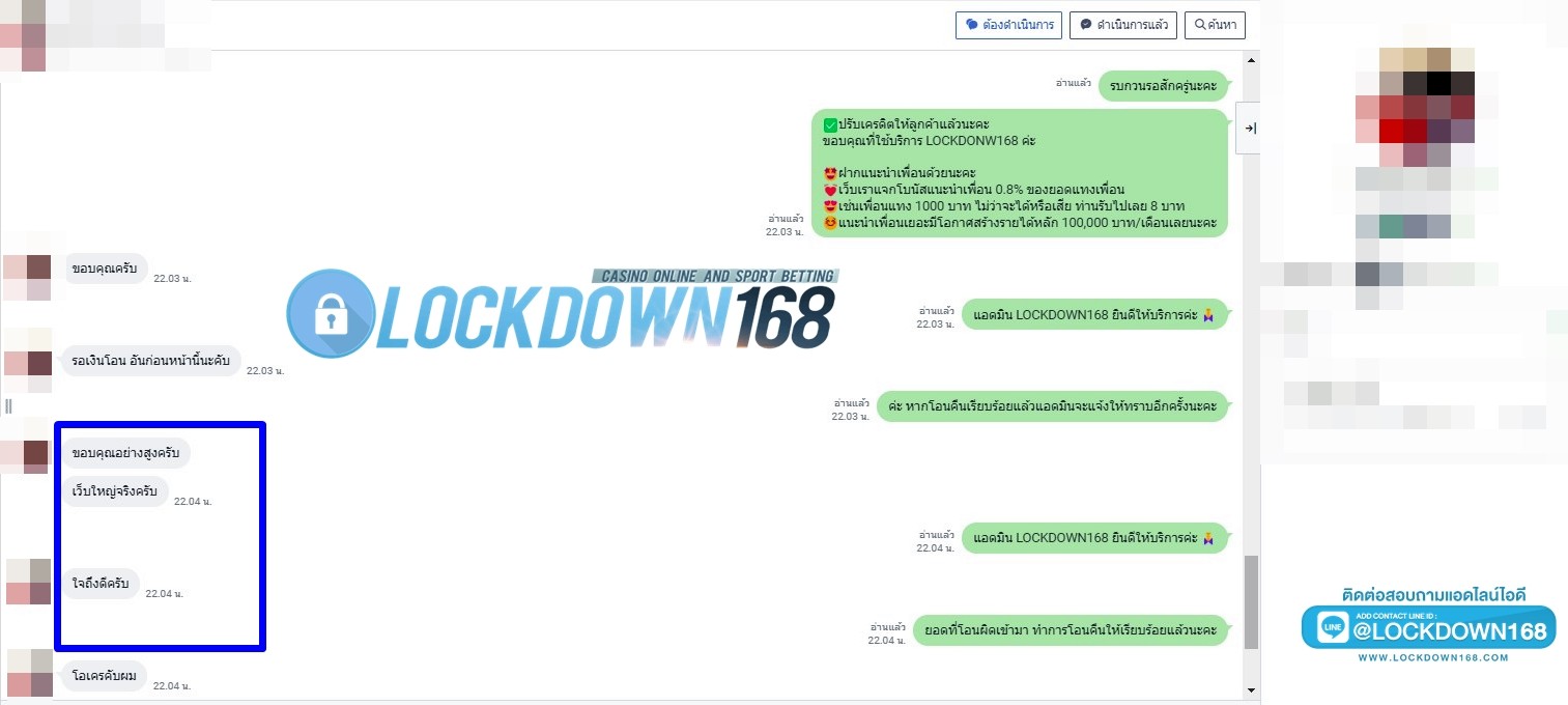LOCKDOWN168.COM คาสิโนออนไลน์น้องใหม่ที่มาแรงที่สุดในตอนนี้ ด้วยระบบฝาก-ถอนอัตโนมัติ ที่ใช้เทคโนโลยีการจับยอดแบบใหม่ จับยอดฝากได้ภายใน 10 วินาที สามารถเล่นได้ทันทีหลังทำการโอนเงิน และระบบถอนเงินที่สามารถถอนเงินที่หน้าเว็ปได้ด้วยตัวท่านเอง โดยไม่ต้องแจ้งแอดมินและยอดเงินจะเข้าหลังจากทำการถอนภายใน 5 นาที เว็ปของเราคำนึงถึงความสะดวกสบายของลูกค้าเป็นหลัก หากลูกค้าพบปัญหาใดๆก็จะมีเจ้าหน้าที่แอดมินค่อยดูแลอำนวยความสะดวกให้คุณลูกค้าตลอด 24 ชั่วโมง