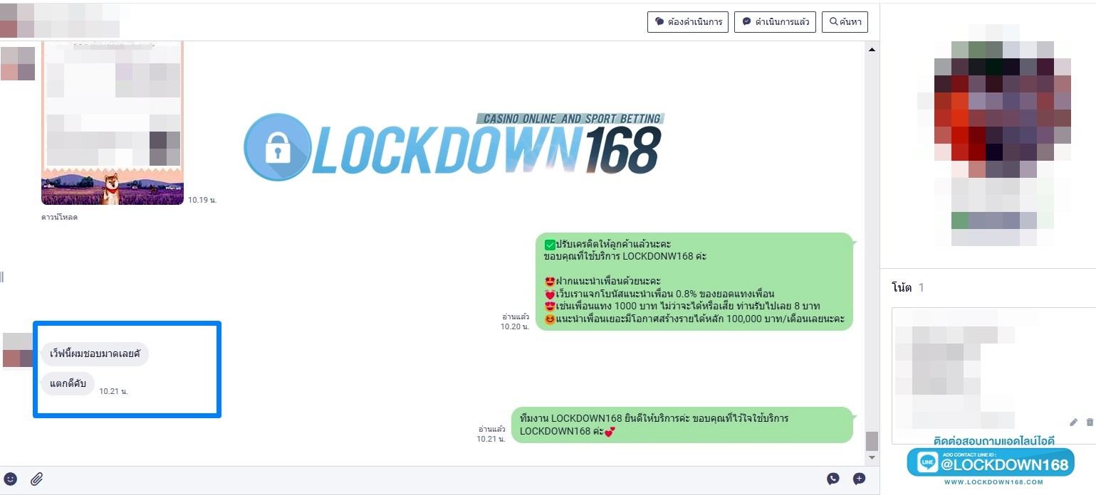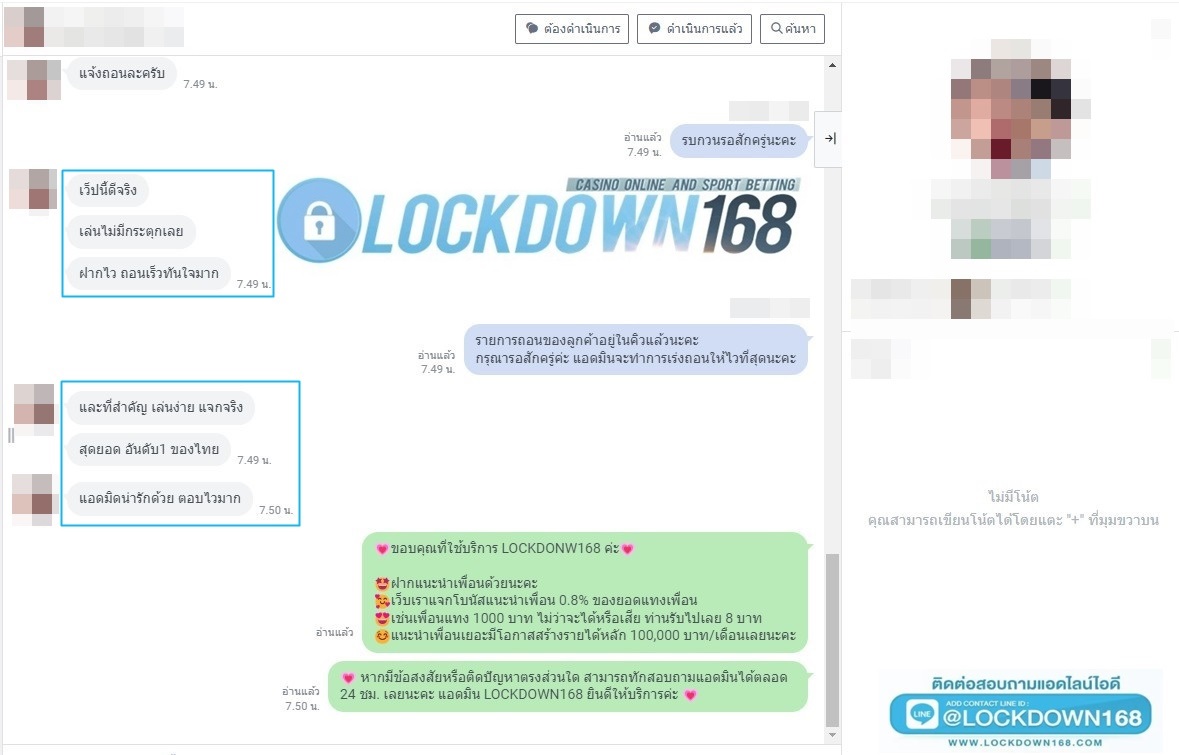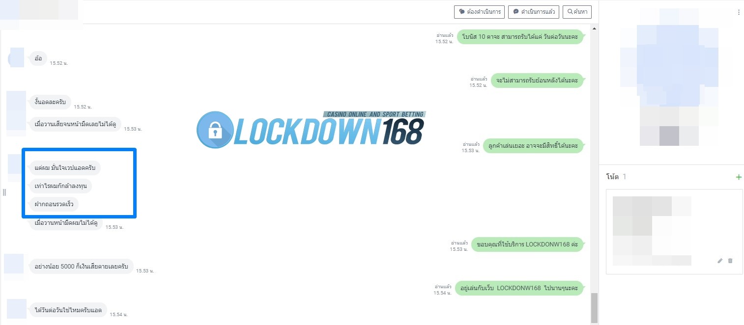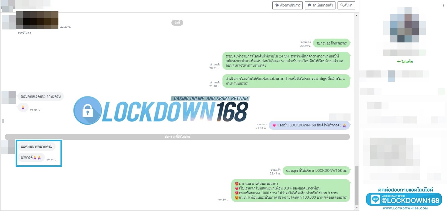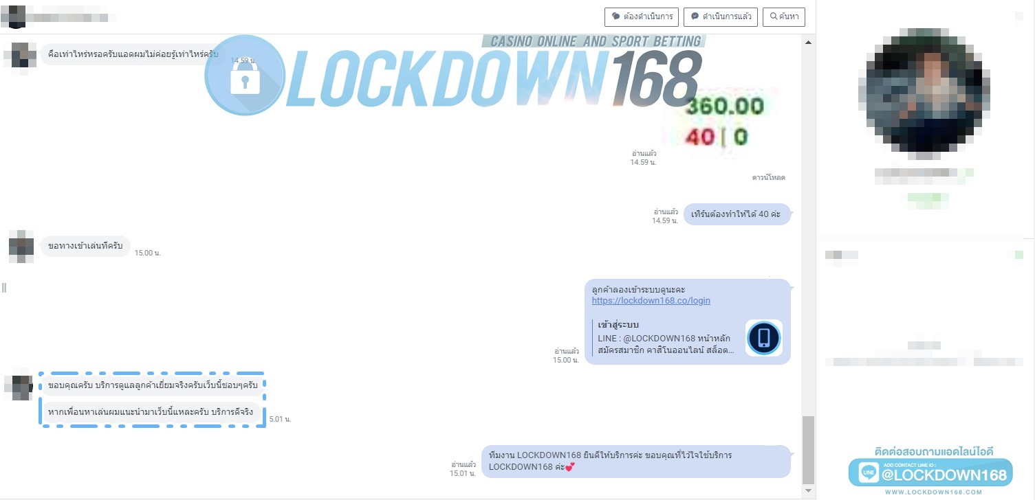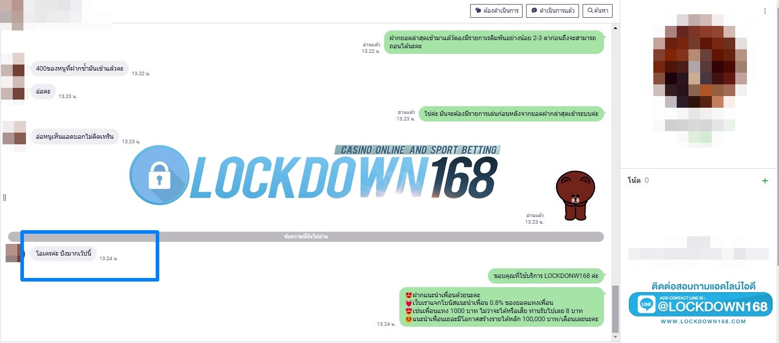 LOCKDOWN168.COM คาสิโนออนไลน์น้องใหม่ที่มาแรงที่สุดในตอนนี้ ด้วยระบบฝาก-ถอนอัตโนมัติ ที่ใช้เทคโนโลยีการจับยอดแบบใหม่ จับยอดฝากได้ภายใน 10 วินาที สามารถเล่นได้ทันทีหลังทำการโอนเงิน และระบบถอนเงินที่สามารถถอนเงินที่หน้าเว็ปได้ด้วยตัวท่านเอง โดยไม่ต้องแจ้งแอดมินและยอดเงินจะเข้าหลังจากทำการถอนภายใน 5 นาที เว็ปของเราคำนึงถึงความสะดวกสบายของลูกค้าเป็นหลัก หากลูกค้าพบปัญหาใดๆก็จะมีเจ้าหน้าที่แอดมินค่อยดูแลอำนวยความสะดวกให้คุณลูกค้าตลอด 24 ชั่วโมง