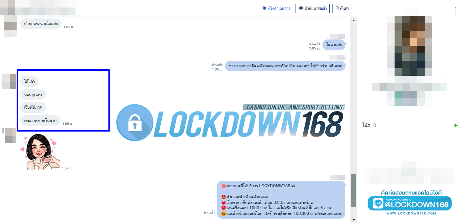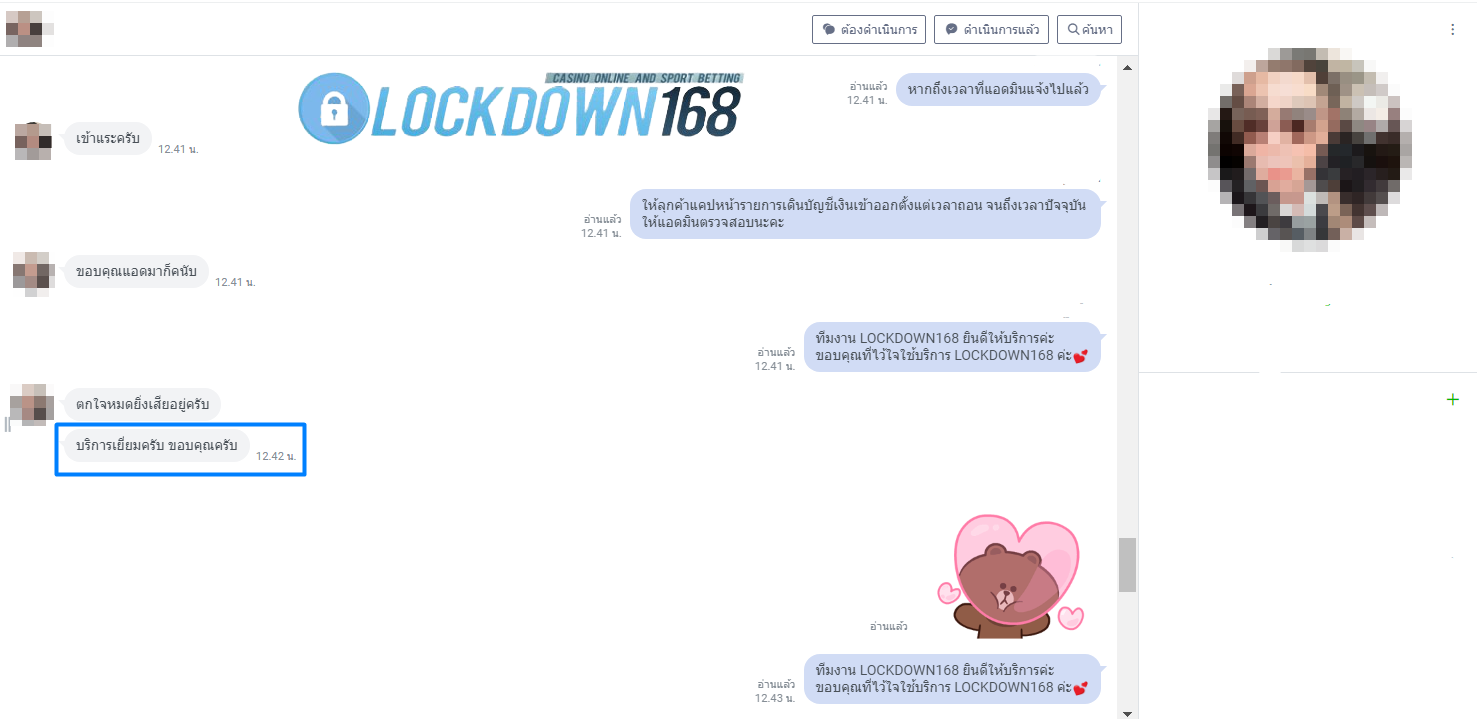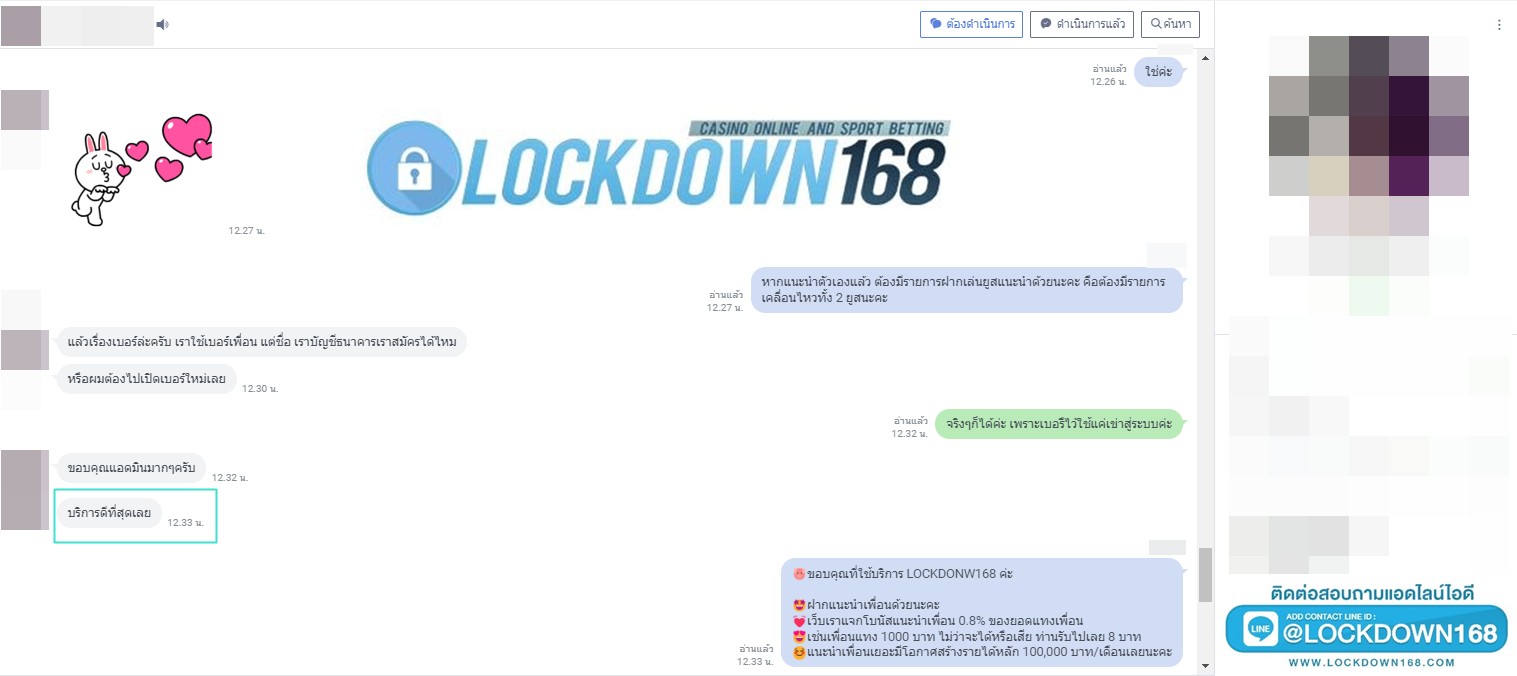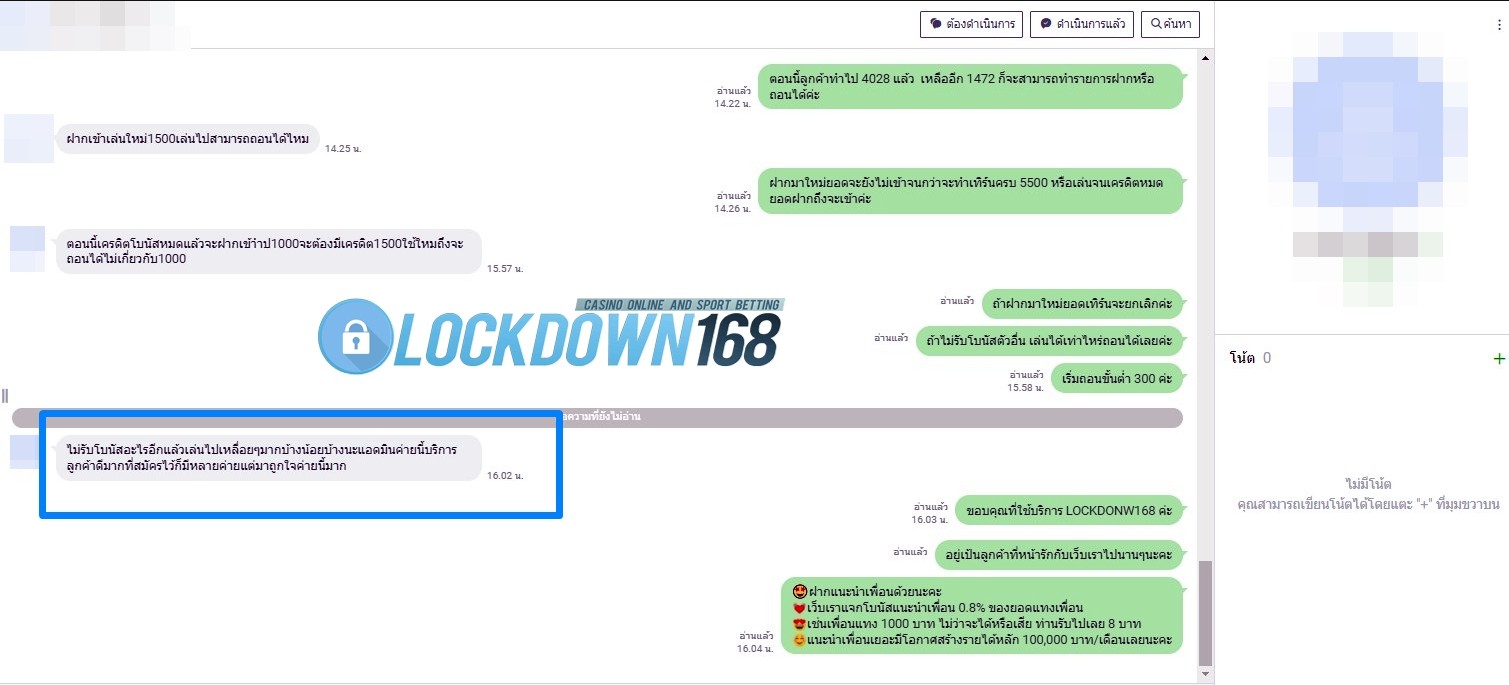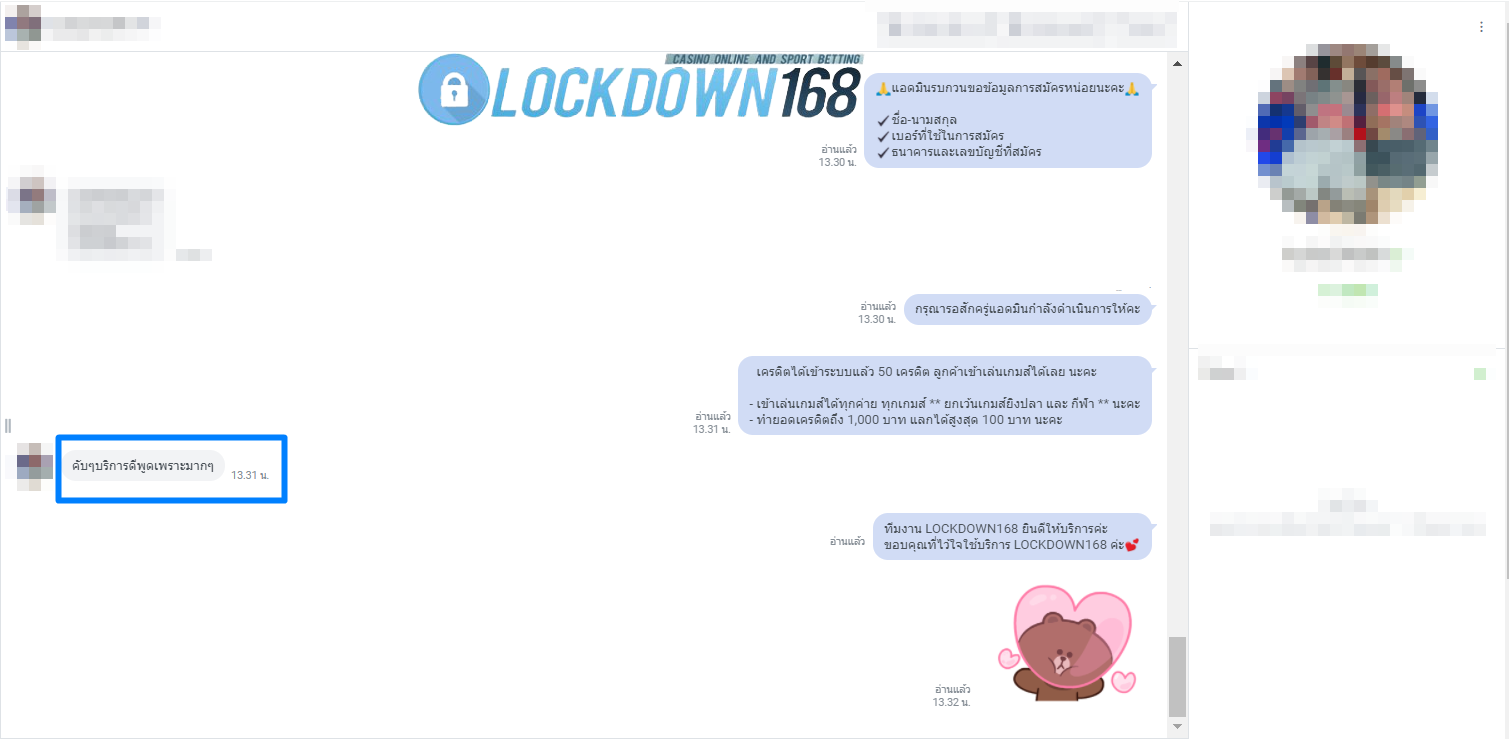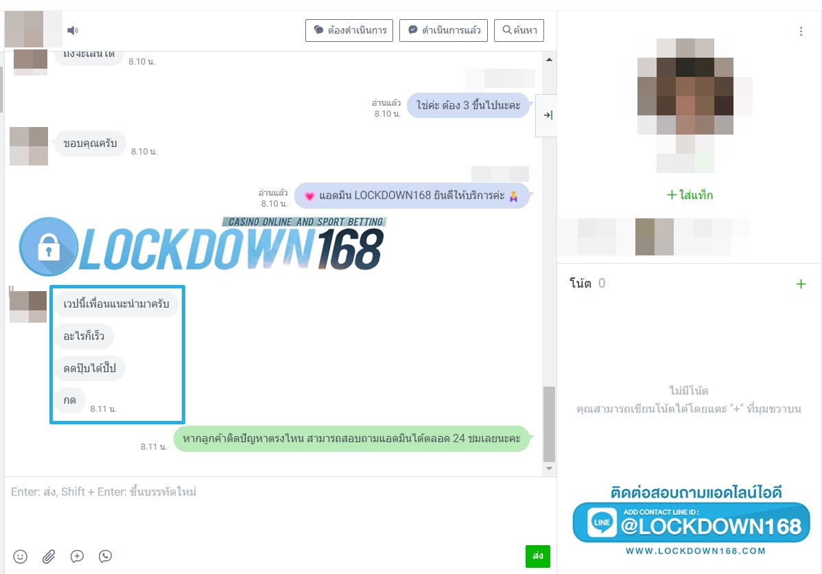 LOCKDOWN168.COM คาสิโนออนไลน์น้องใหม่ที่มาแรงที่สุดในตอนนี้ ด้วยระบบฝาก-ถอนอัตโนมัติ ที่ใช้เทคโนโลยีการจับยอดแบบใหม่ จับยอดฝากได้ภายใน 10 วินาที สามารถเล่นได้ทันทีหลังทำการโอนเงิน และระบบถอนเงินที่สามารถถอนเงินที่หน้าเว็ปได้ด้วยตัวท่านเอง โดยไม่ต้องแจ้งแอดมินและยอดเงินจะเข้าหลังจากทำการถอนภายใน 5 นาที เว็ปของเราคำนึงถึงความสะดวกสบายของลูกค้าเป็นหลัก หากลูกค้าพบปัญหาใดๆก็จะมีเจ้าหน้าที่แอดมินค่อยดูแลอำนวยความสะดวกให้คุณลูกค้าตลอด 24 ชั่วโมง