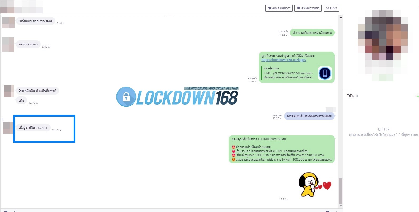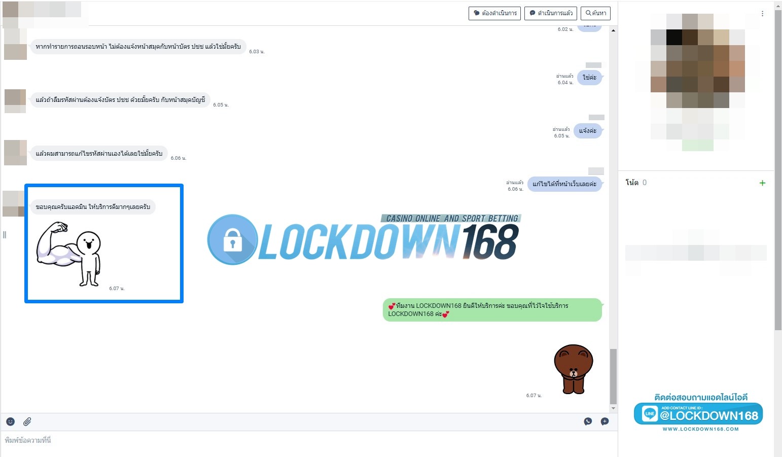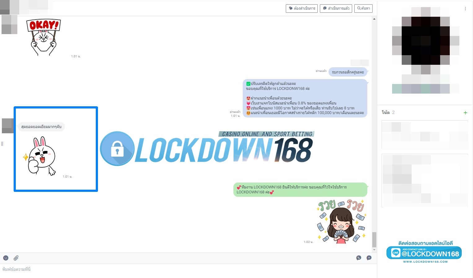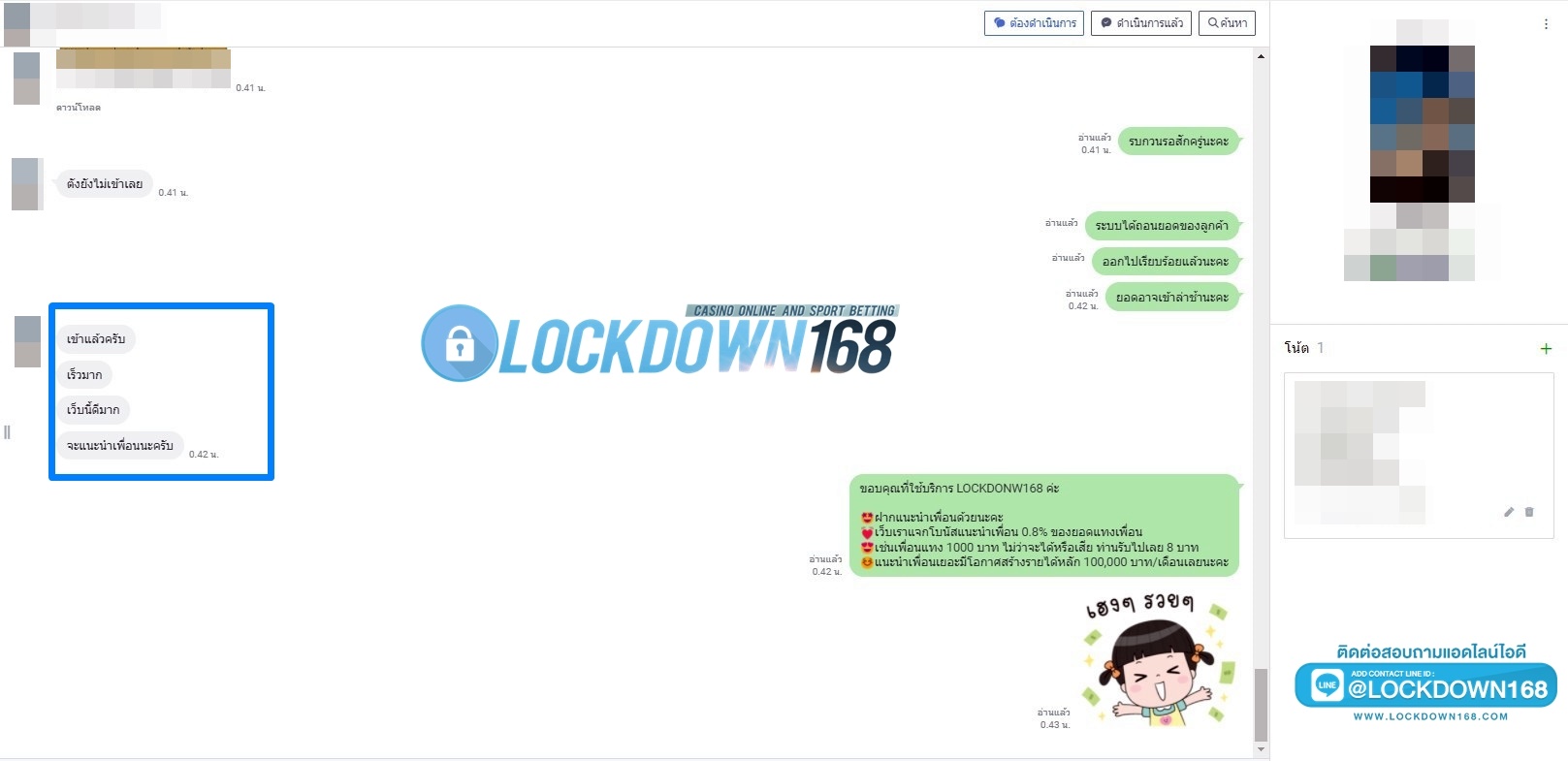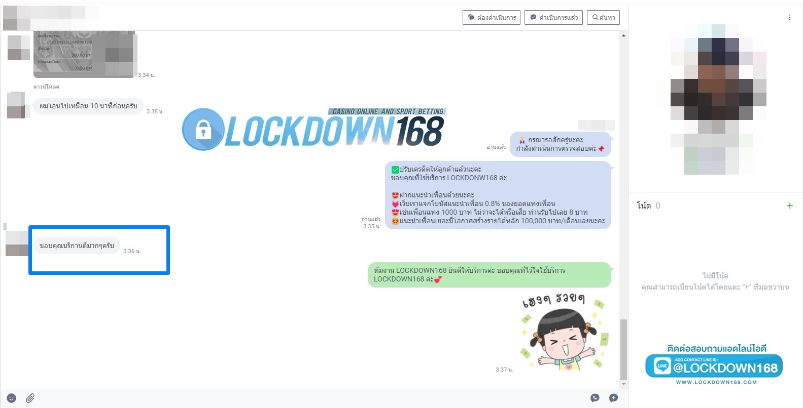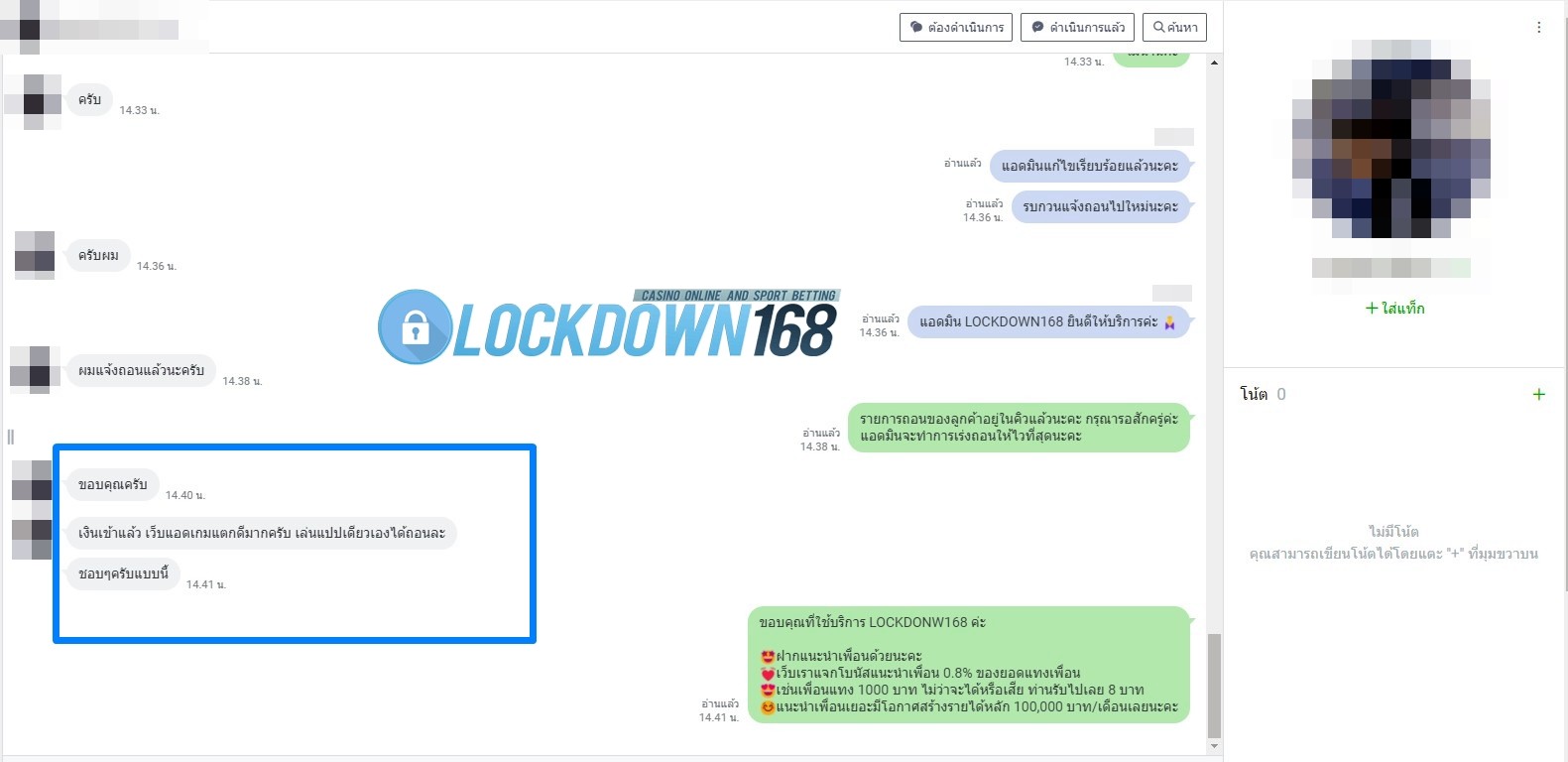 LOCKDOWN168.COM คาสิโนออนไลน์น้องใหม่ที่มาแรงที่สุดในตอนนี้ ด้วยระบบฝาก-ถอนอัตโนมัติ ที่ใช้เทคโนโลยีการจับยอดแบบใหม่ จับยอดฝากได้ภายใน 10 วินาที สามารถเล่นได้ทันทีหลังทำการโอนเงิน และระบบถอนเงินที่สามารถถอนเงินที่หน้าเว็ปได้ด้วยตัวท่านเอง โดยไม่ต้องแจ้งแอดมินและยอดเงินจะเข้าหลังจากทำการถอนภายใน 5 นาที เว็ปของเราคำนึงถึงความสะดวกสบายของลูกค้าเป็นหลัก หากลูกค้าพบปัญหาใดๆก็จะมีเจ้าหน้าที่แอดมินค่อยดูแลอำนวยความสะดวกให้คุณลูกค้าตลอด 24 ชั่วโมง