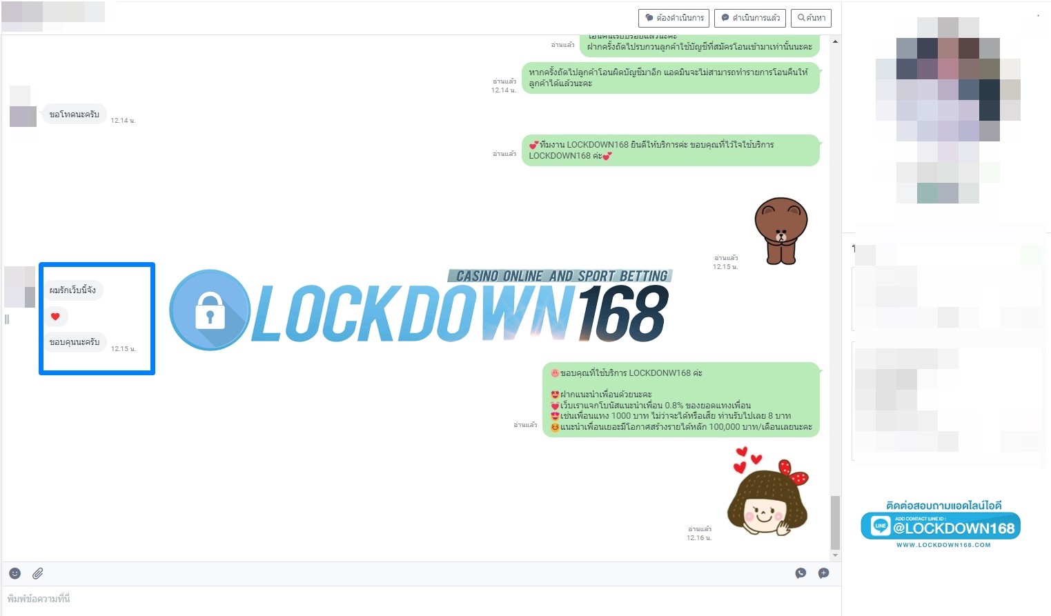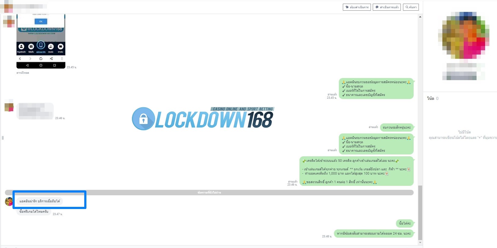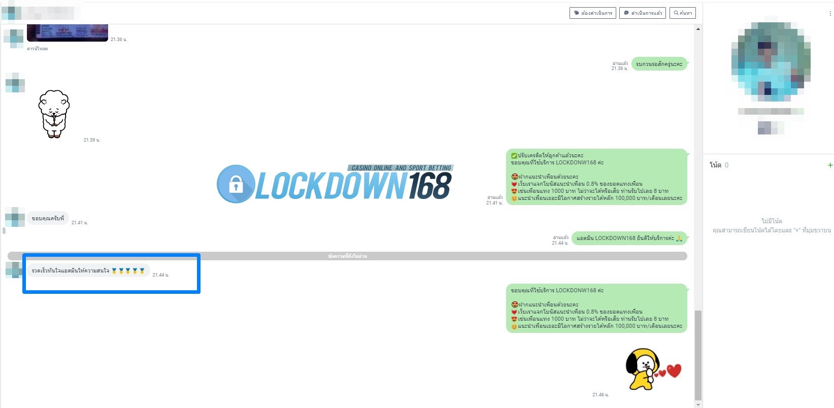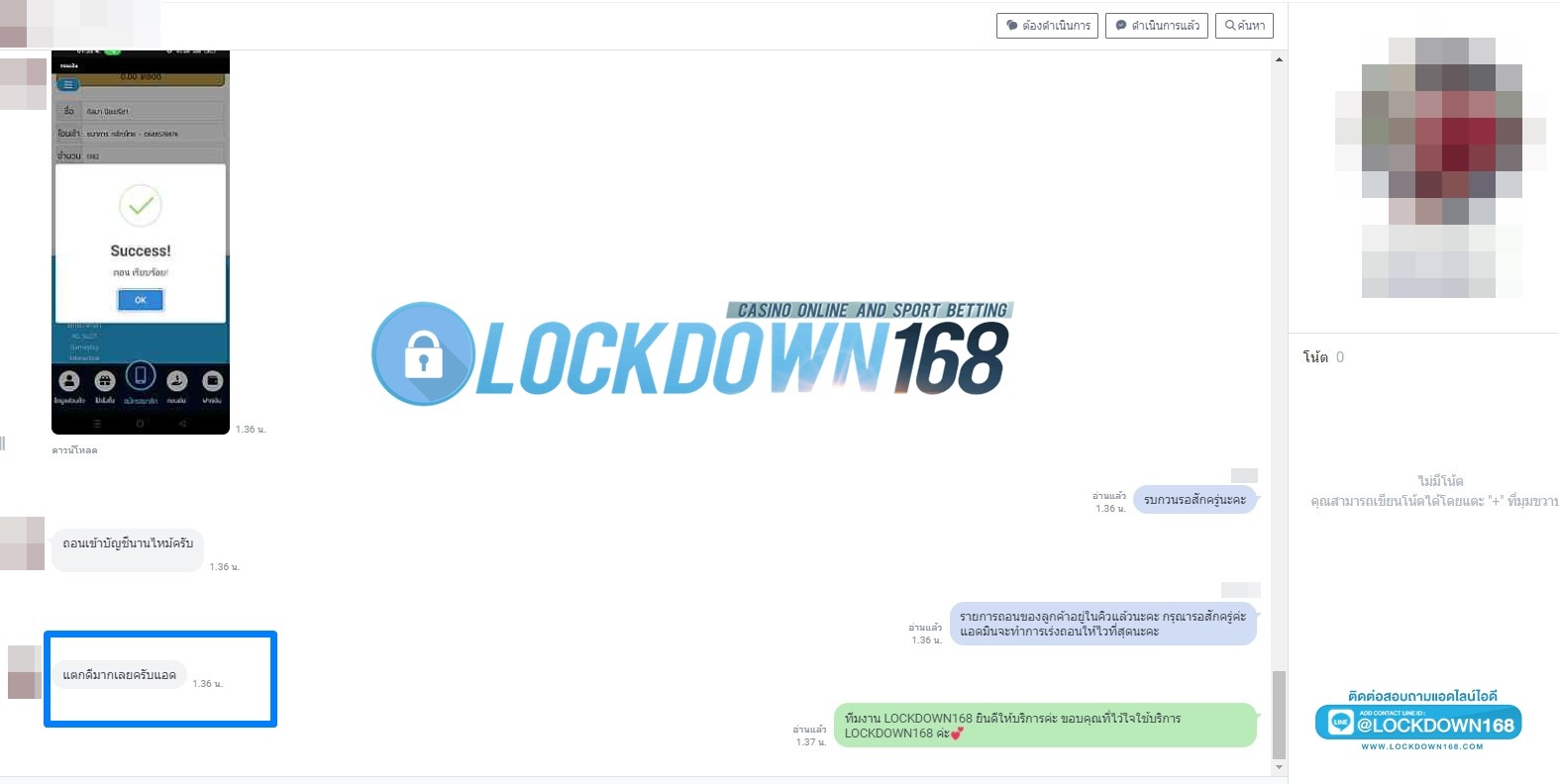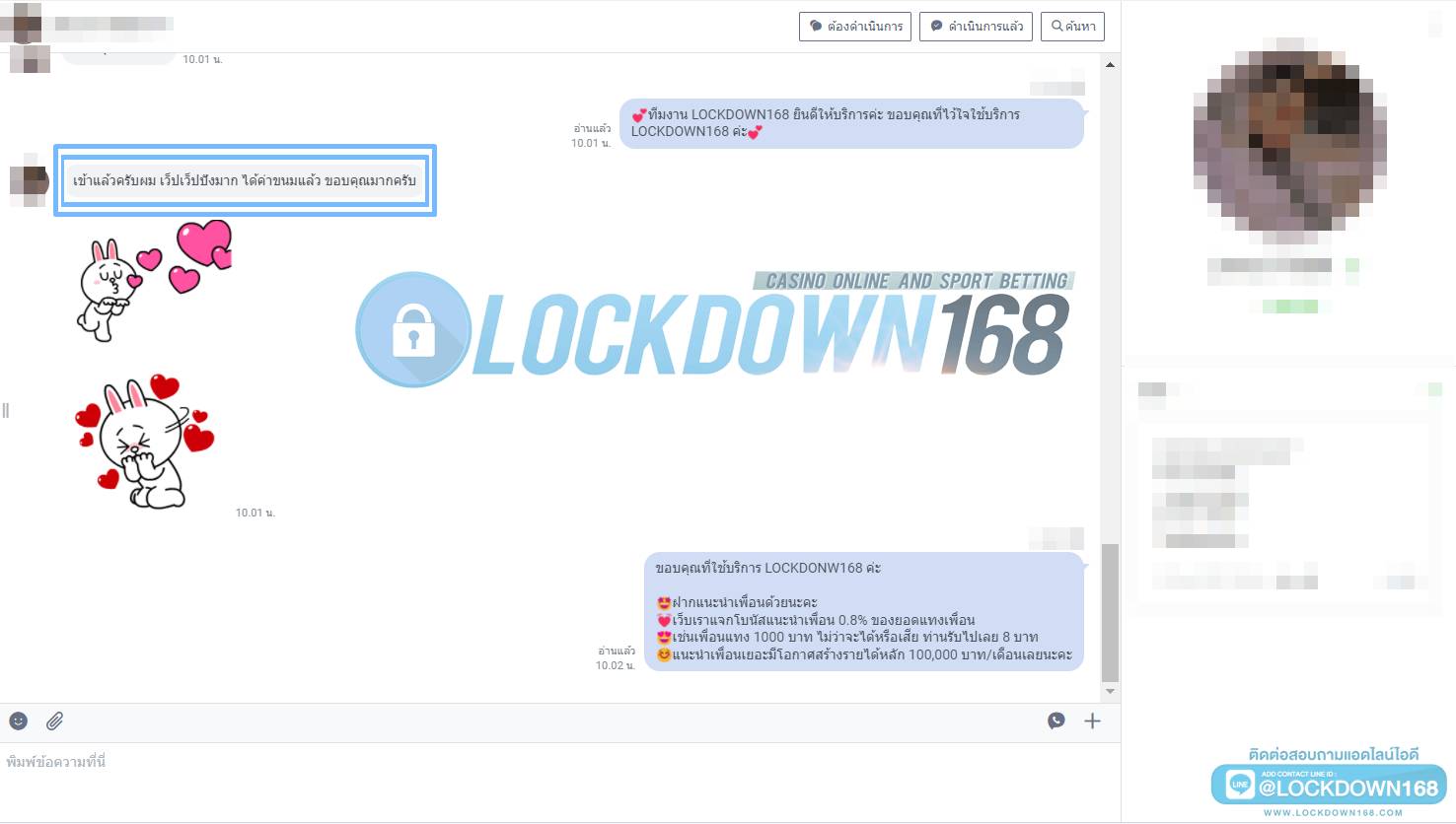 LOCKDOWN168.COM คาสิโนออนไลน์น้องใหม่ที่มาแรงที่สุดในตอนนี้ ด้วยระบบฝาก-ถอนอัตโนมัติ ที่ใช้เทคโนโลยีการจับยอดแบบใหม่ จับยอดฝากได้ภายใน 10 วินาที สามารถเล่นได้ทันทีหลังทำการโอนเงิน และระบบถอนเงินที่สามารถถอนเงินที่หน้าเว็ปได้ด้วยตัวท่านเอง โดยไม่ต้องแจ้งแอดมินและยอดเงินจะเข้าหลังจากทำการถอนภายใน 5 นาที เว็ปของเราคำนึงถึงความสะดวกสบายของลูกค้าเป็นหลัก หากลูกค้าพบปัญหาใดๆก็จะมีเจ้าหน้าที่แอดมินค่อยดูแลอำนวยความสะดวกให้คุณลูกค้าตลอด 24 ชั่วโมง