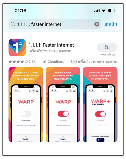 1. ไปที่ App Store แล้วโหลดแอพ ชื่อ 1.1.1.1 Faster Internet