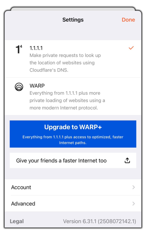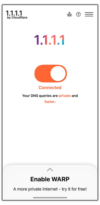 2. เข้าแอพและกดที่ ขีด 3 ขีด มุมบนขวา เลือกที่ 1.1.1.1 ให้ขึ้นเครื่องหมายถูก ✓ ตามภาพ